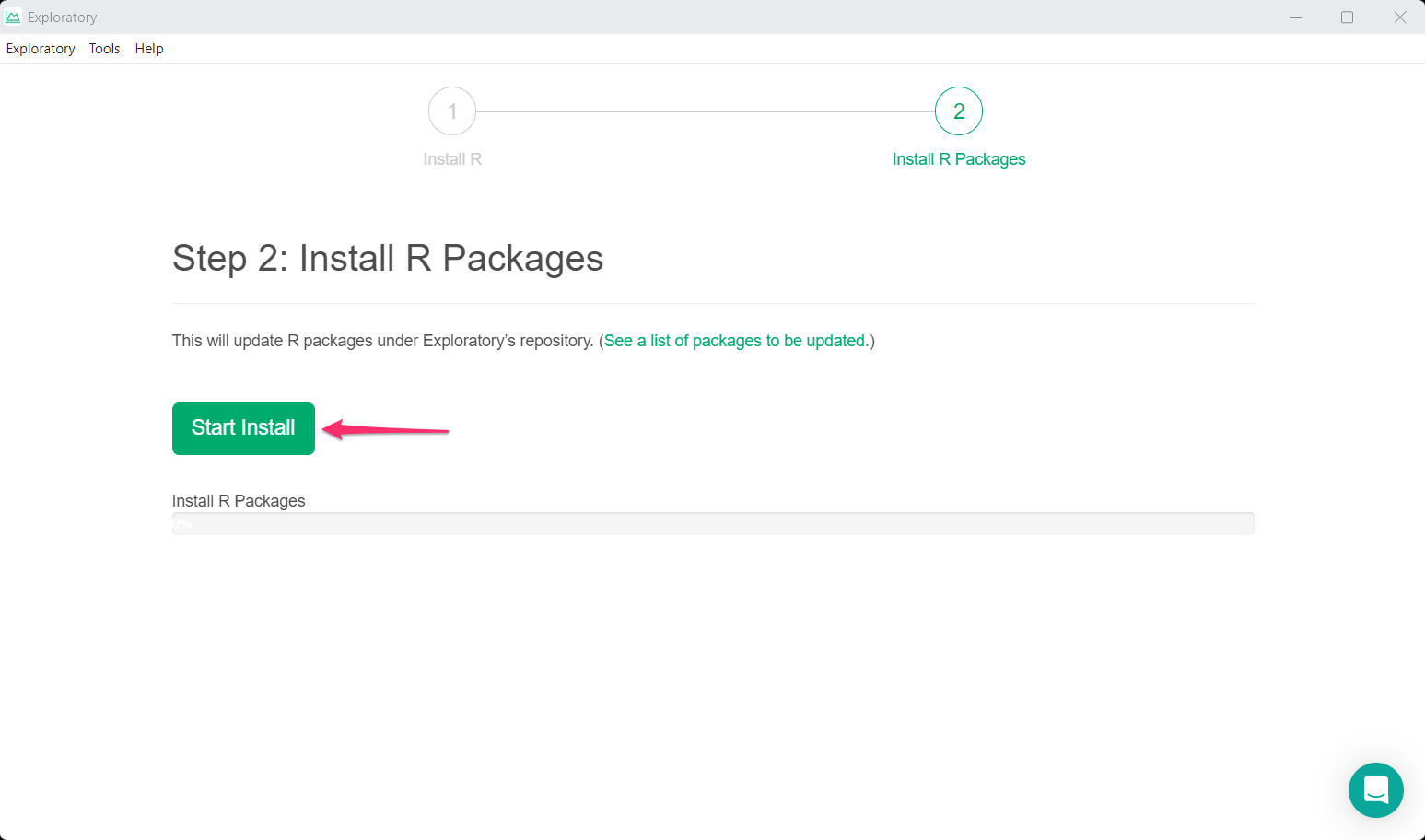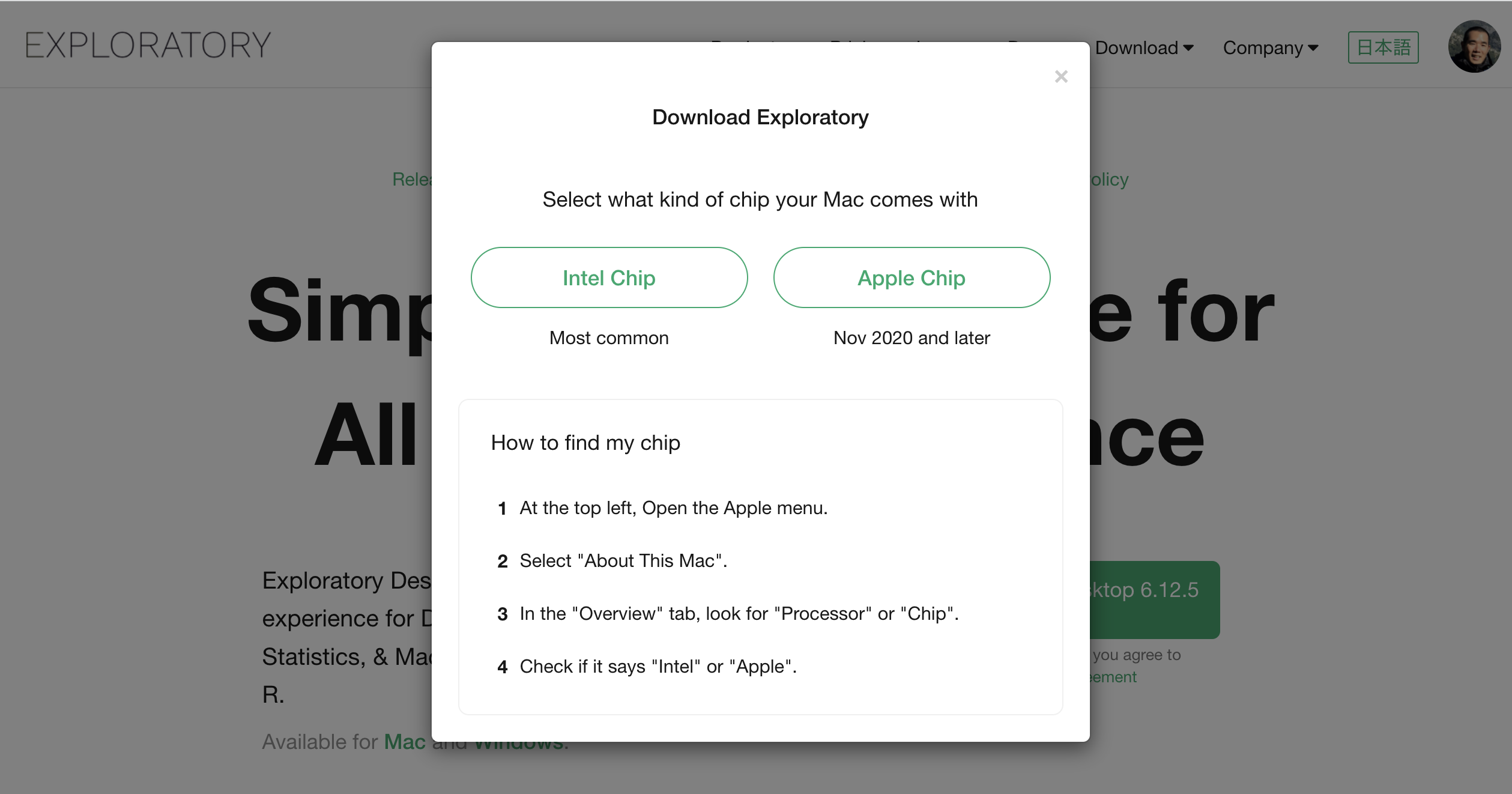 If you encounter any problems during installation, please refer to our troubleshooting guide, or feel free to contact us via email at support@exploratory.io or through the chat window on our website.