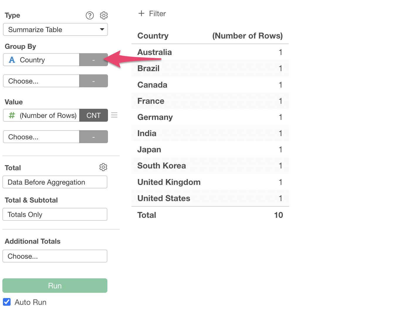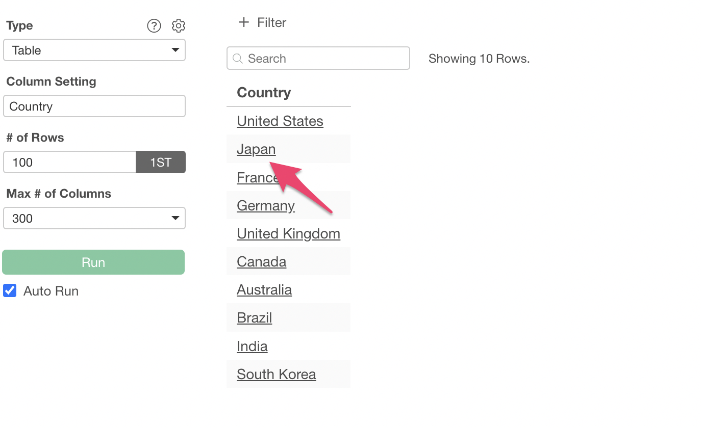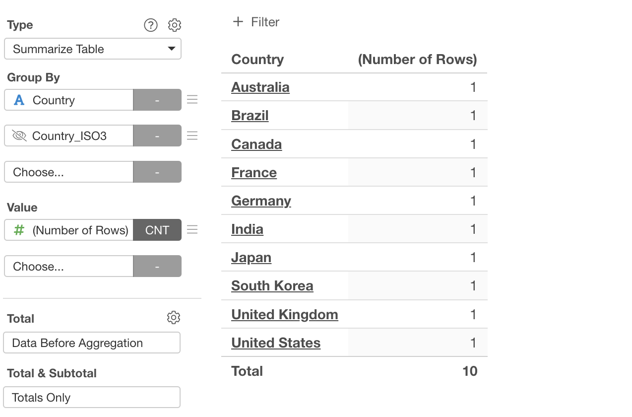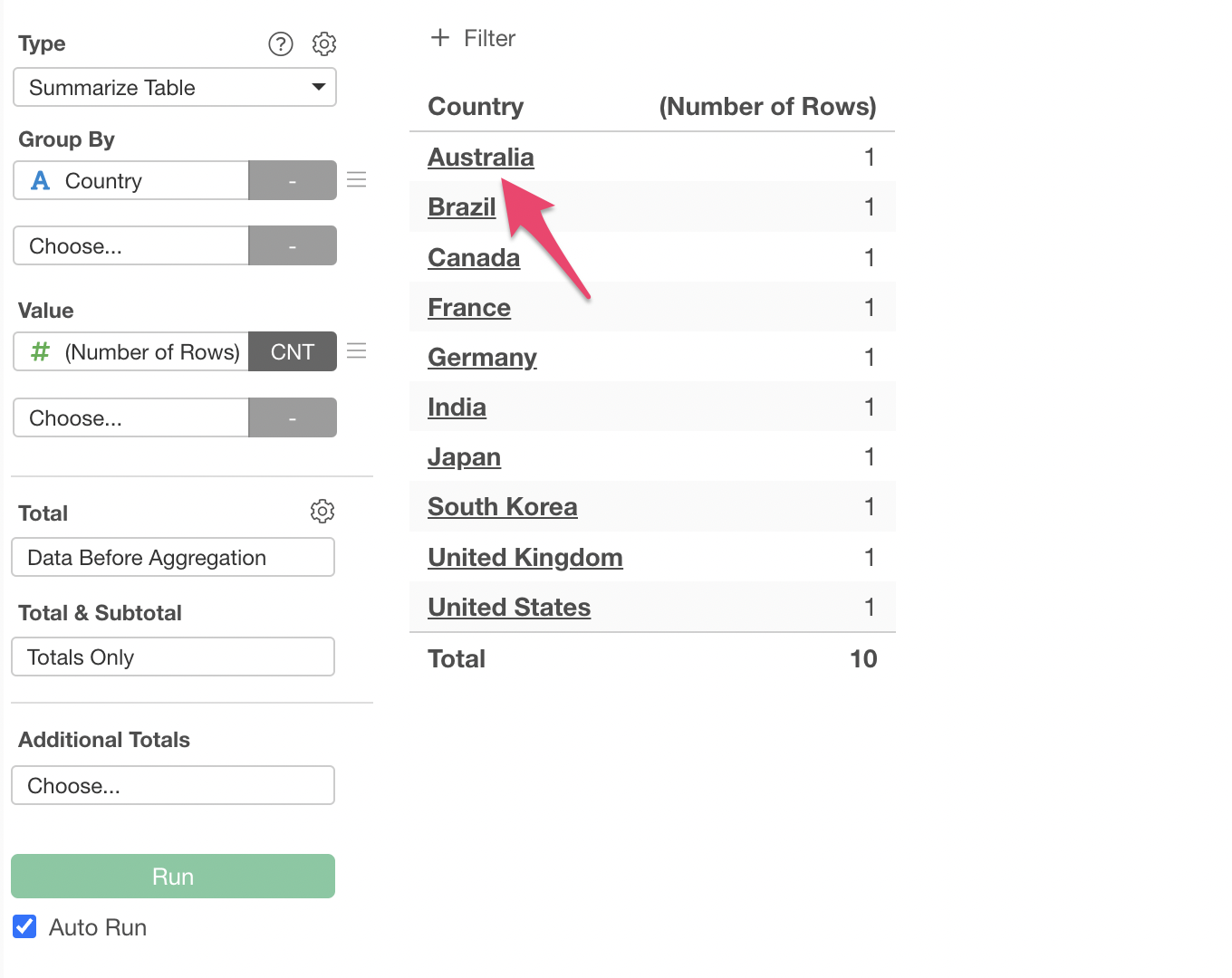 This will make the corresponding column in your summarize table clickable, based on its values. For example, if you click “Australia”:
