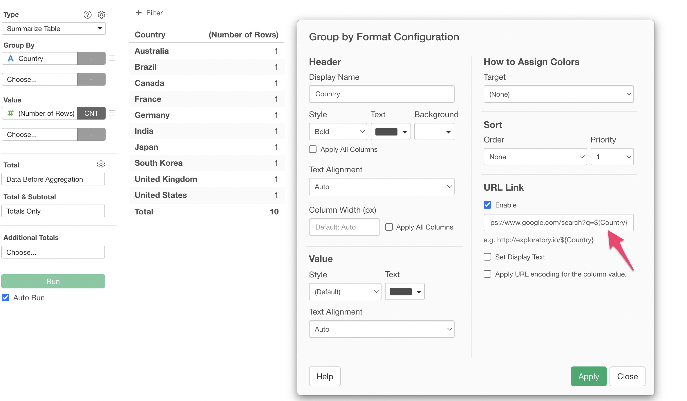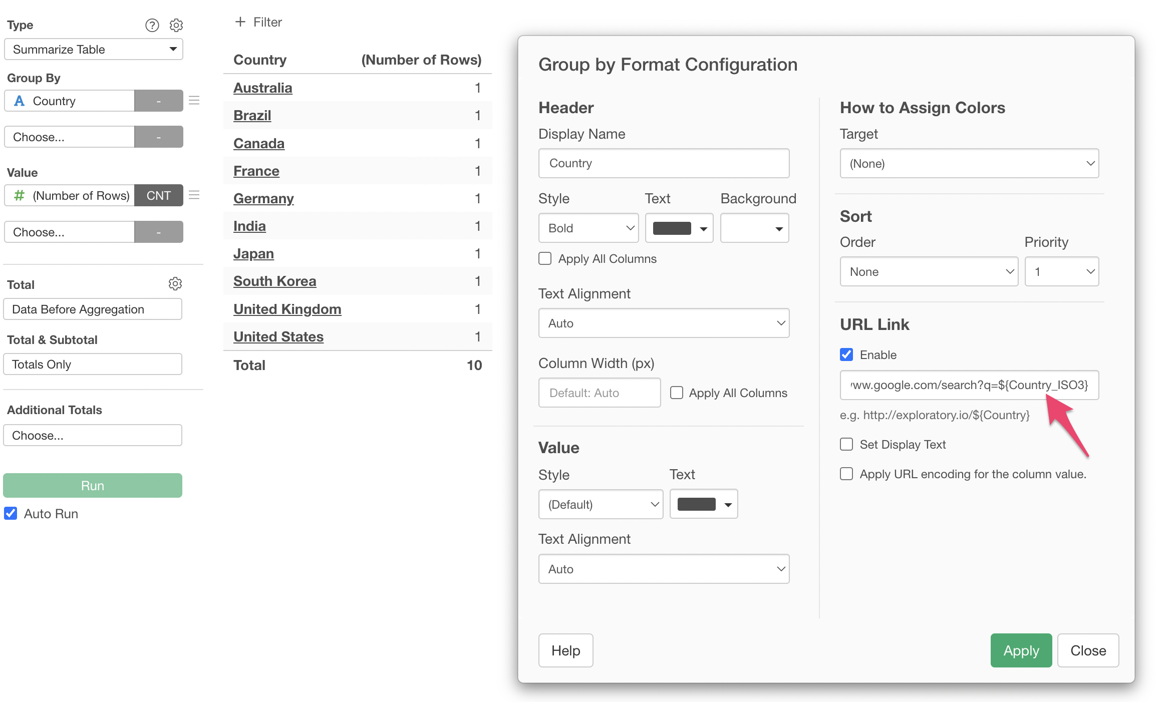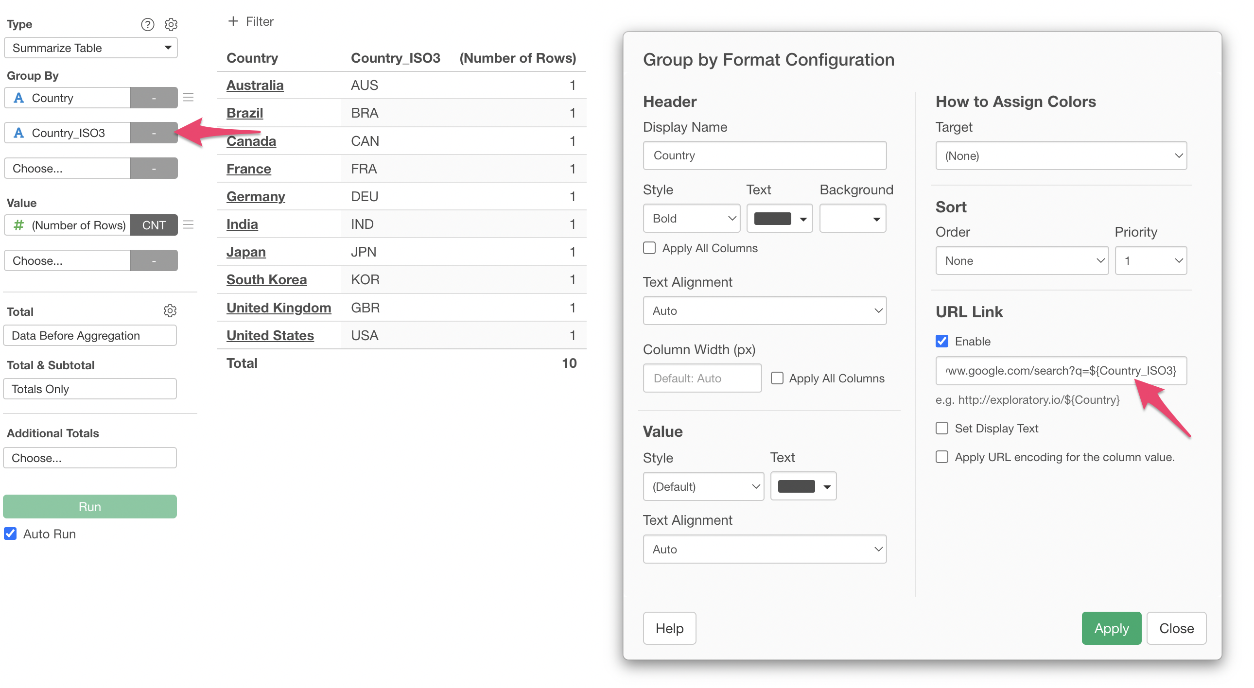 Now, the corresponding column in your summarize table or pivot table is linked, using the column’s own value appended to the base URL.