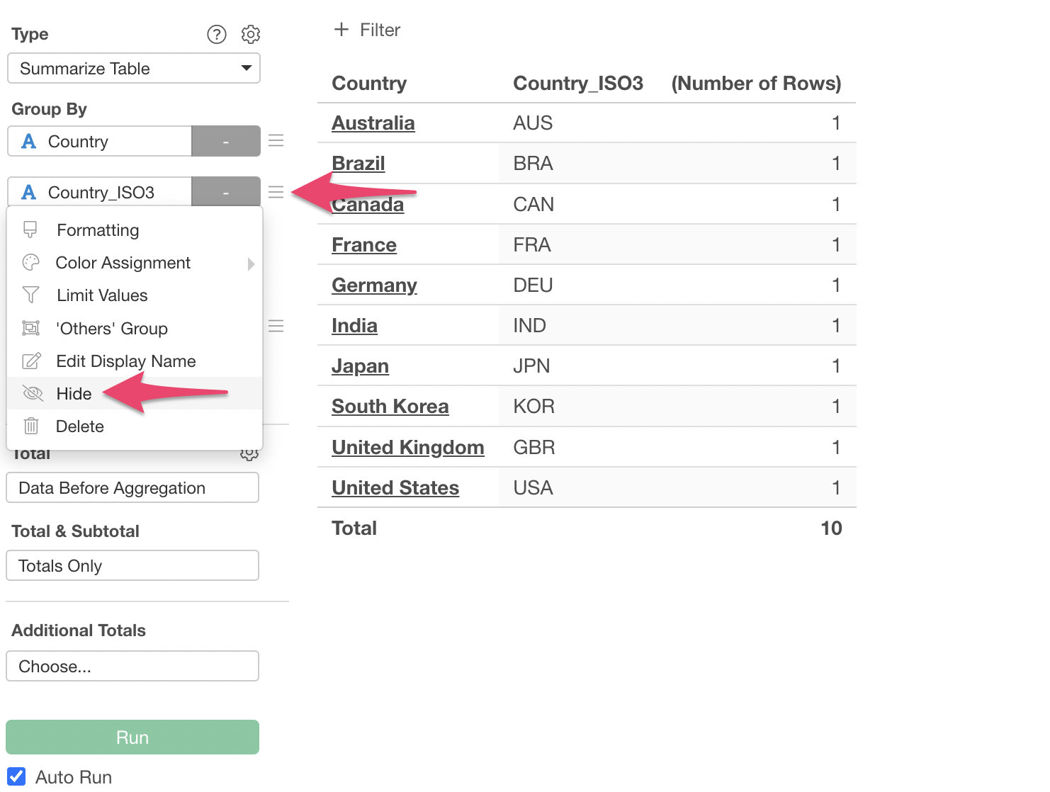 If you wish to hide the column used for the URL link (e.g., Country_ISO3), use the “Hide” option from the column’s menu.