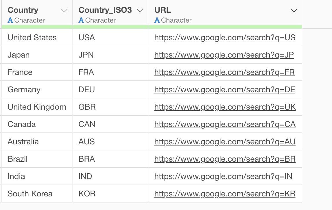This time, we will use the following data and make the ‘Country’ column values clickable URLs.