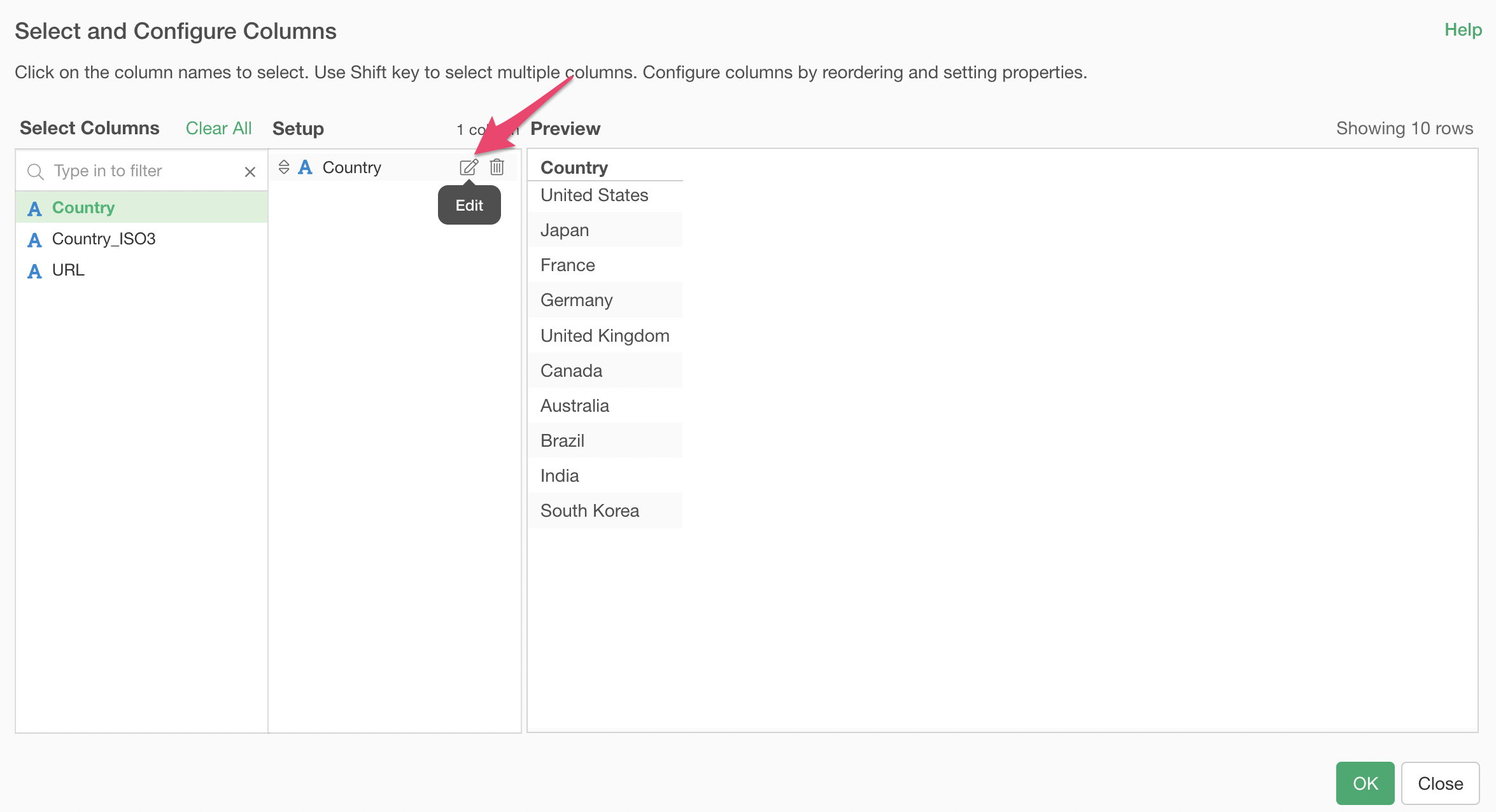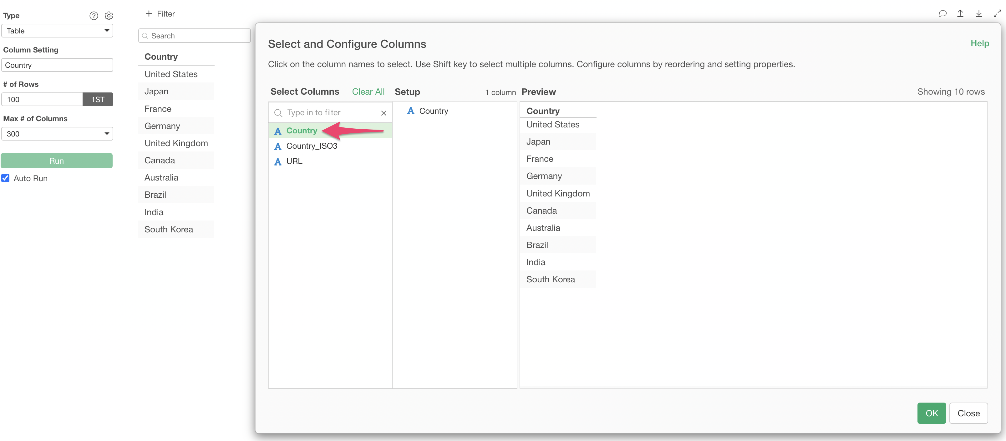 Click on the column you want to display in the table (e.g., Country) to add it.