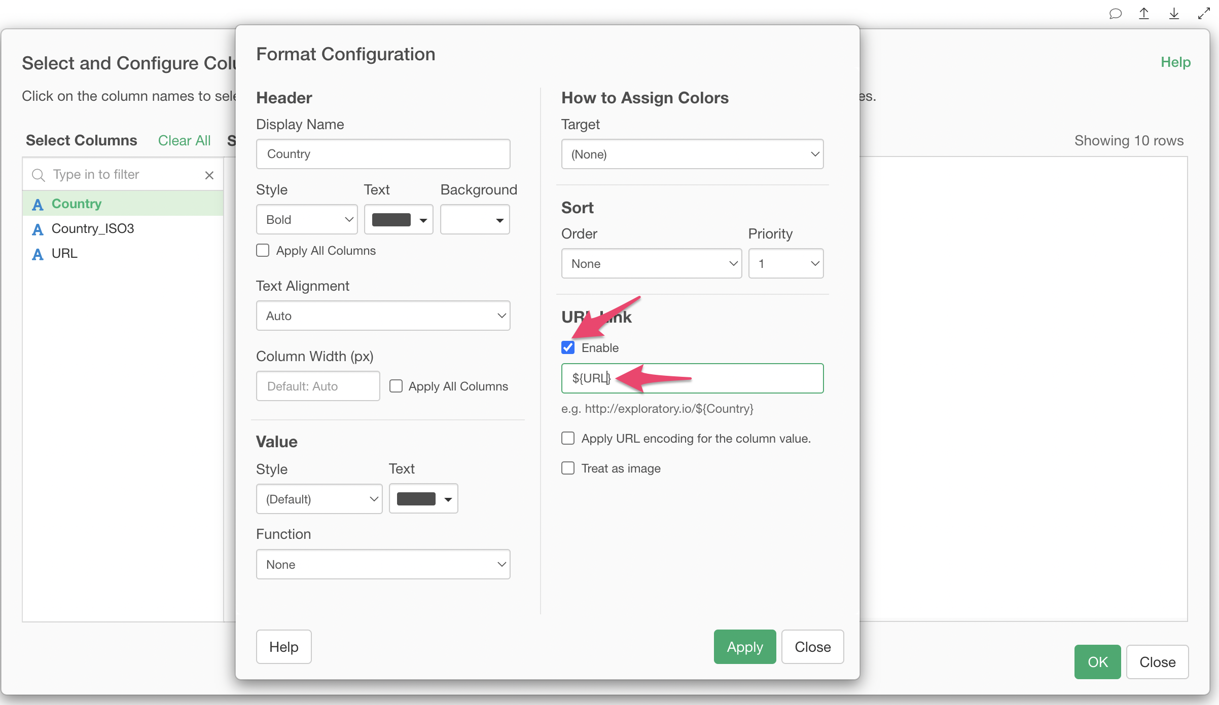In the “Format Configuration” dialog, check “Enable” in the “URL Link” section. In the URL input field, enter the column you want to use as the URL in the format ${Column Name}.