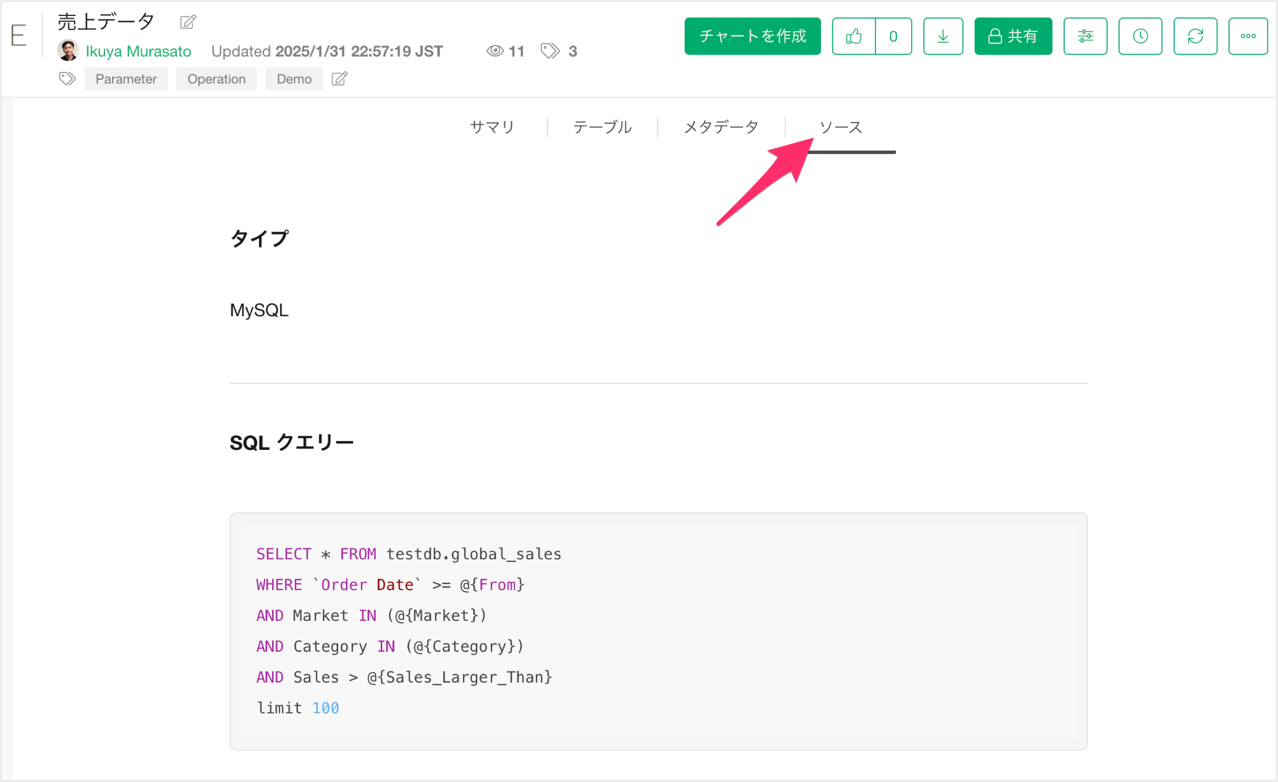 ソースビューでは、このデータがどのようなデータソースから来ているのか、どのようなクエリを使用しているのかを確認できるため、ユーザーは安心してデータを使うことができます。
