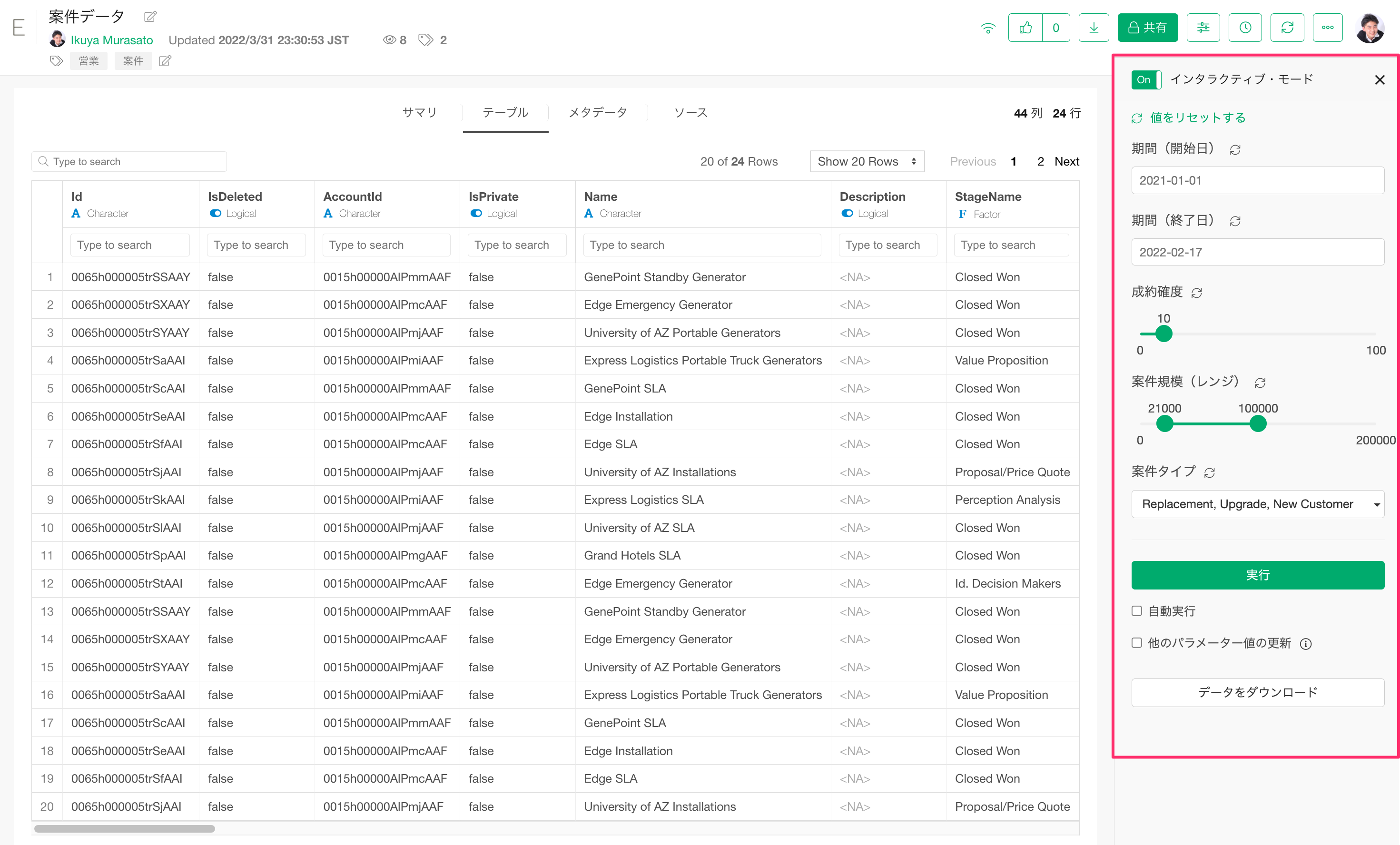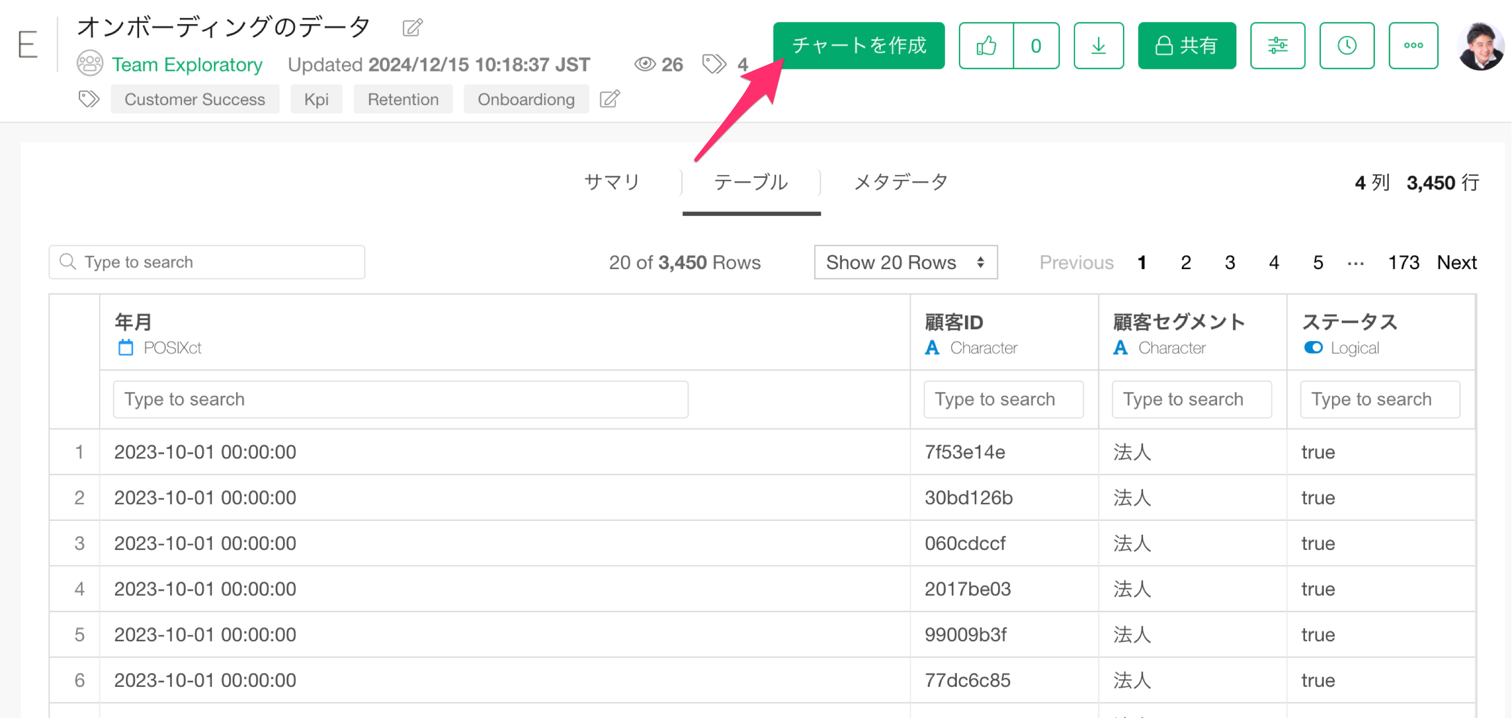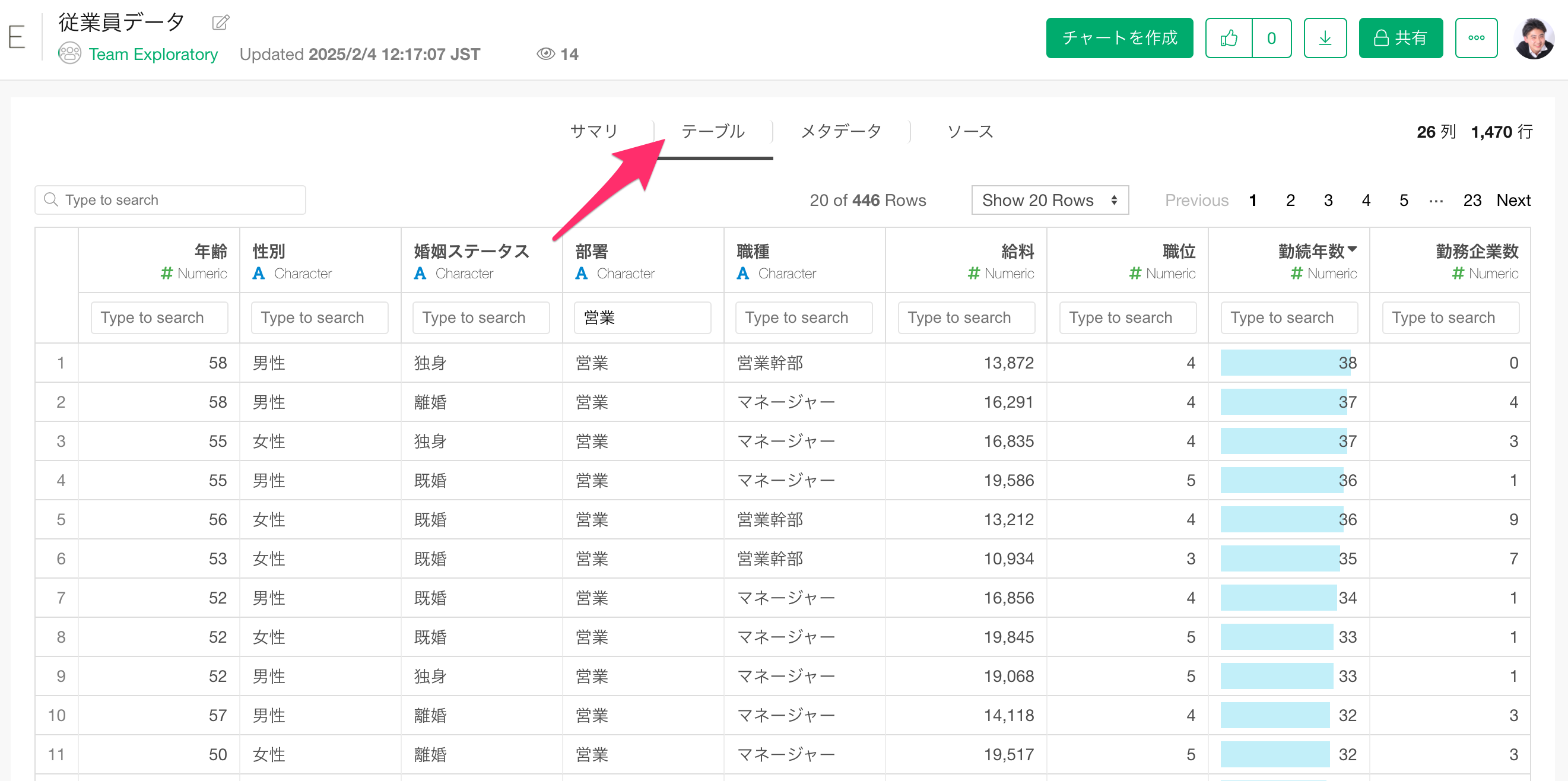 テーブルビューでは、データを表形式で見ることができ、さらにデータをフィルターしたりソートしたりすることができます。データの内容確認自体がデータ活用につながる場合は、これだけで作業が完結することもあります。