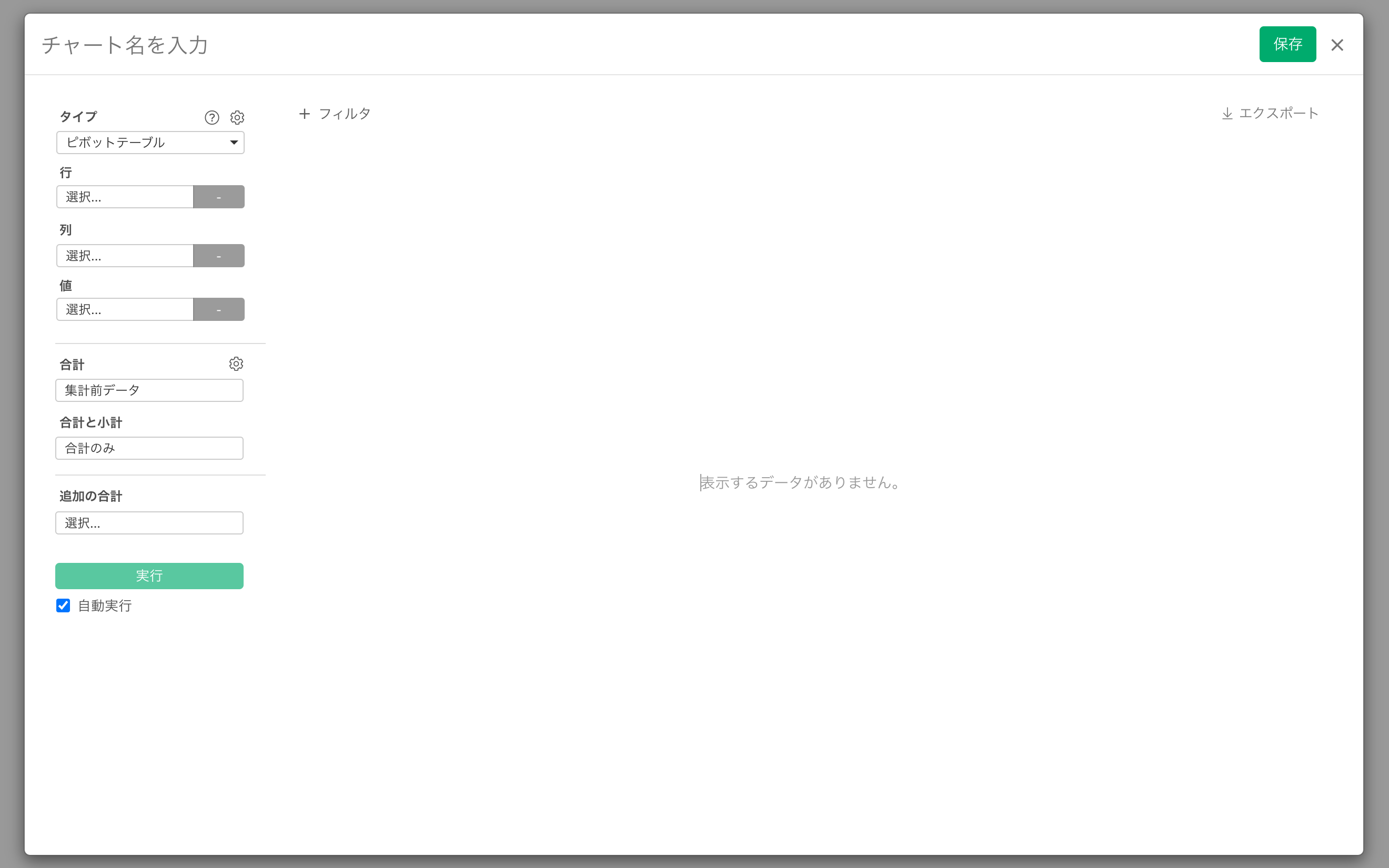 共有されたデータのページ上に表示されるチャートの作成ボタンをクリックすると、チャートを作成・保存するためのダイアログが表示されます。