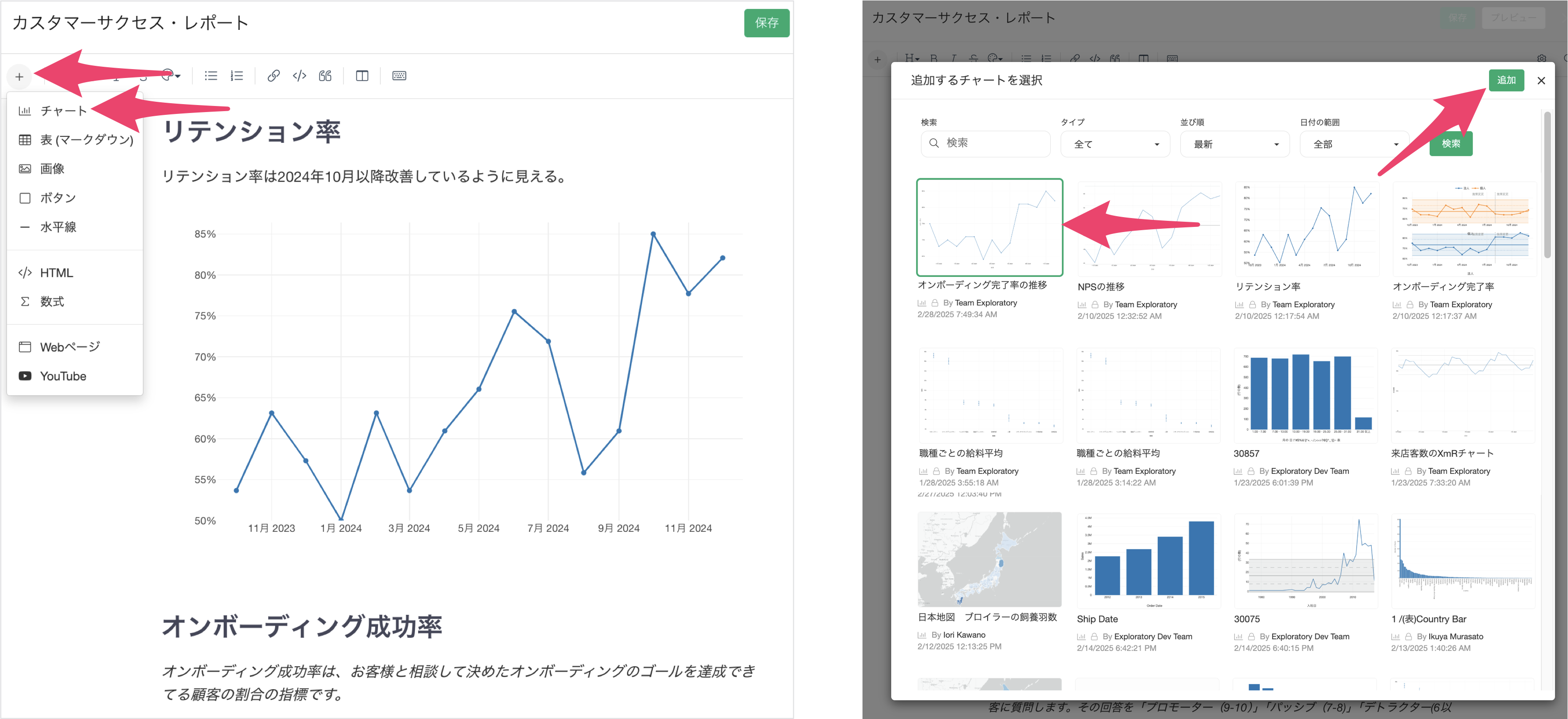 このとき、サーバー上に保存されていて、アクセス権のある全てのチャートをノートに挿入できます。