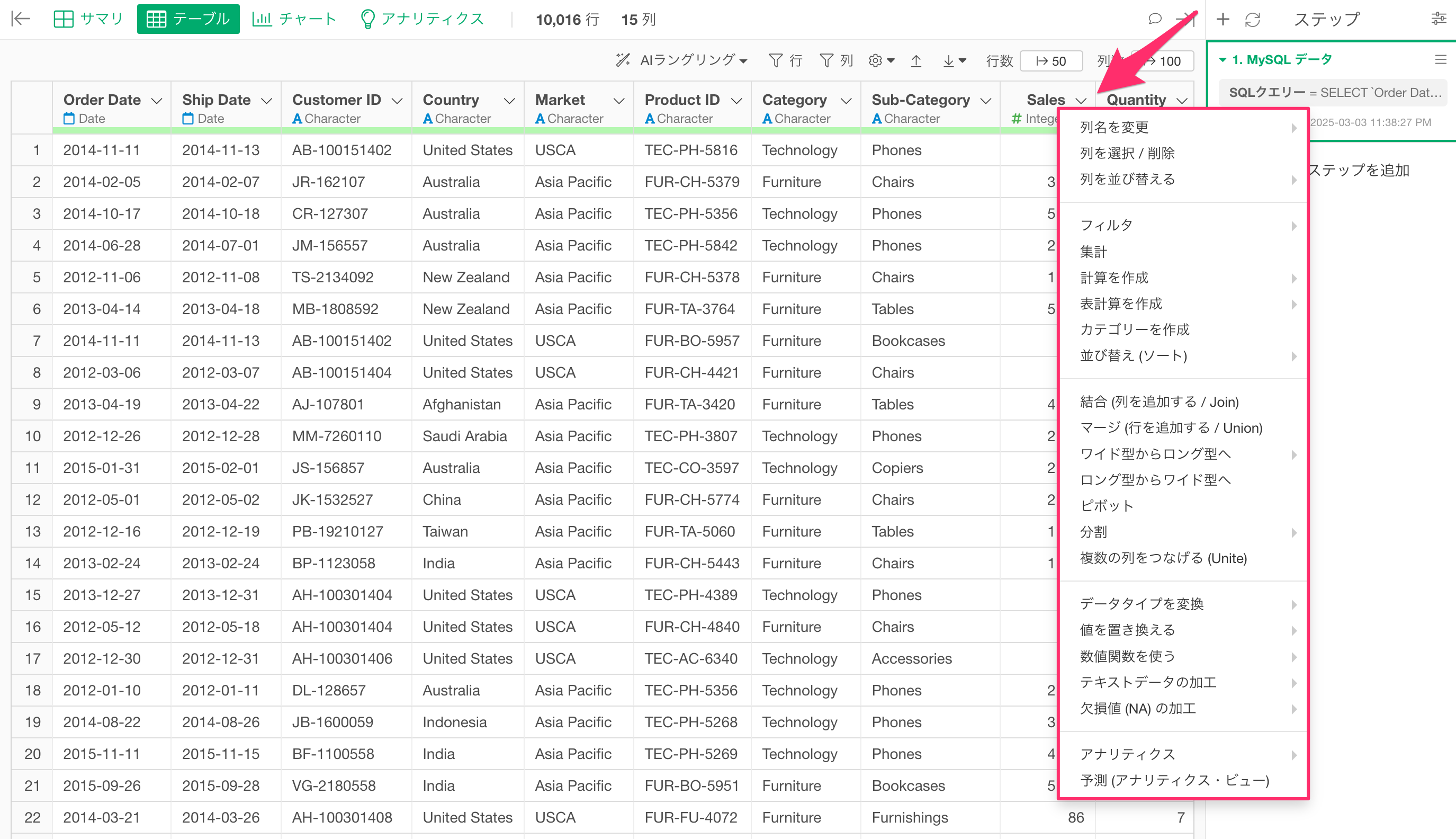 データを取得したら、列ヘッダーメニューから適用したい処理を選択して、UIを通して柔軟にデータを加工できます。