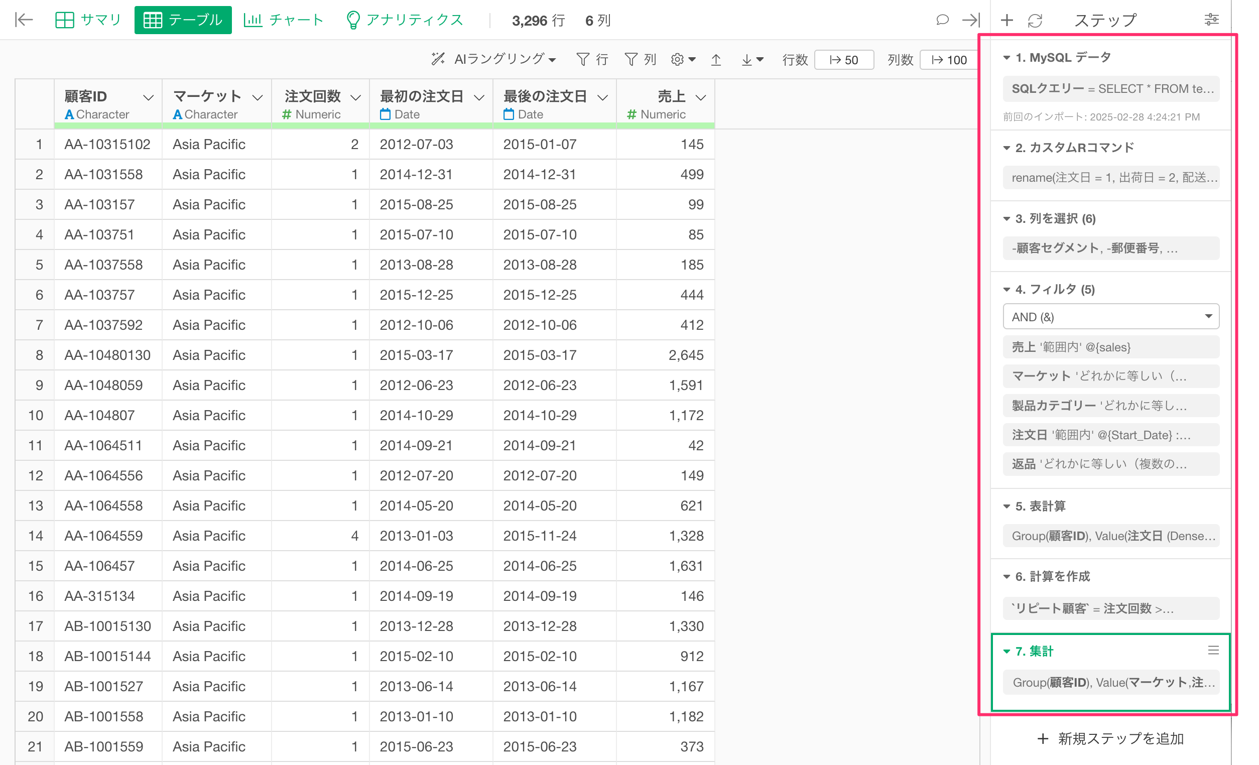 データの加工の処理を追加すると、Exploratory デスクトップの右側にあるデータラングリングのステップに、データの加工の処理が、その処理ごとに保存されます。