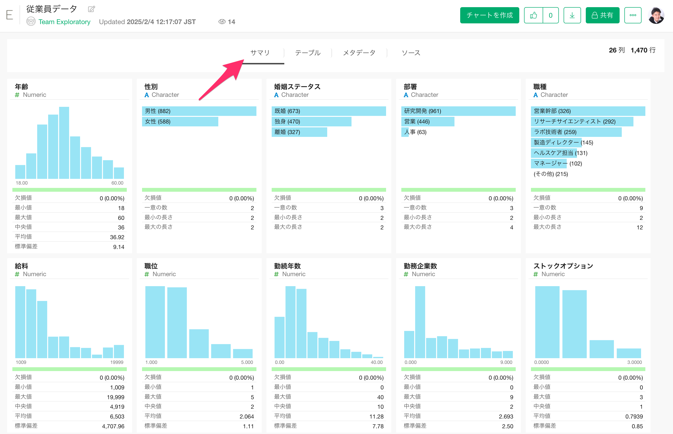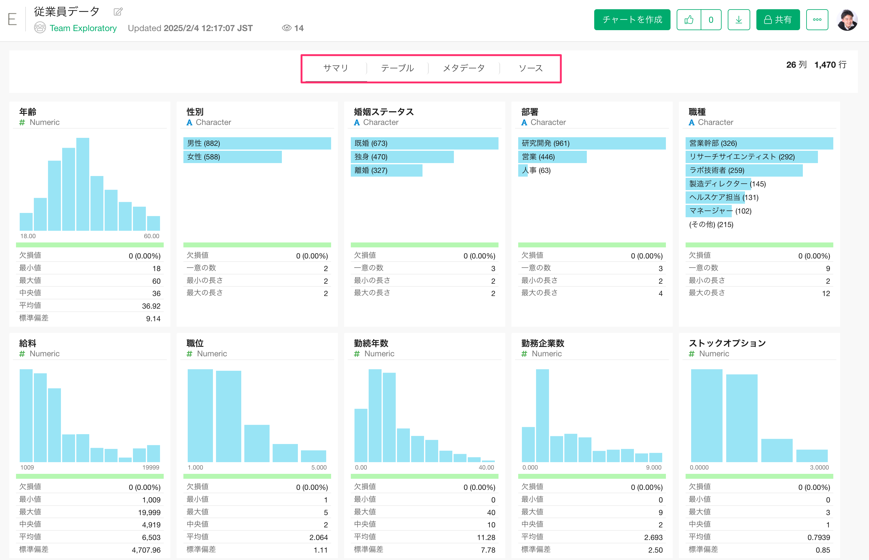 サマリービューでは、Exploratory デスクトップと同様にデータのサマリー情報が表示され、データの概要を瞬時かつ直感的に把握できます。