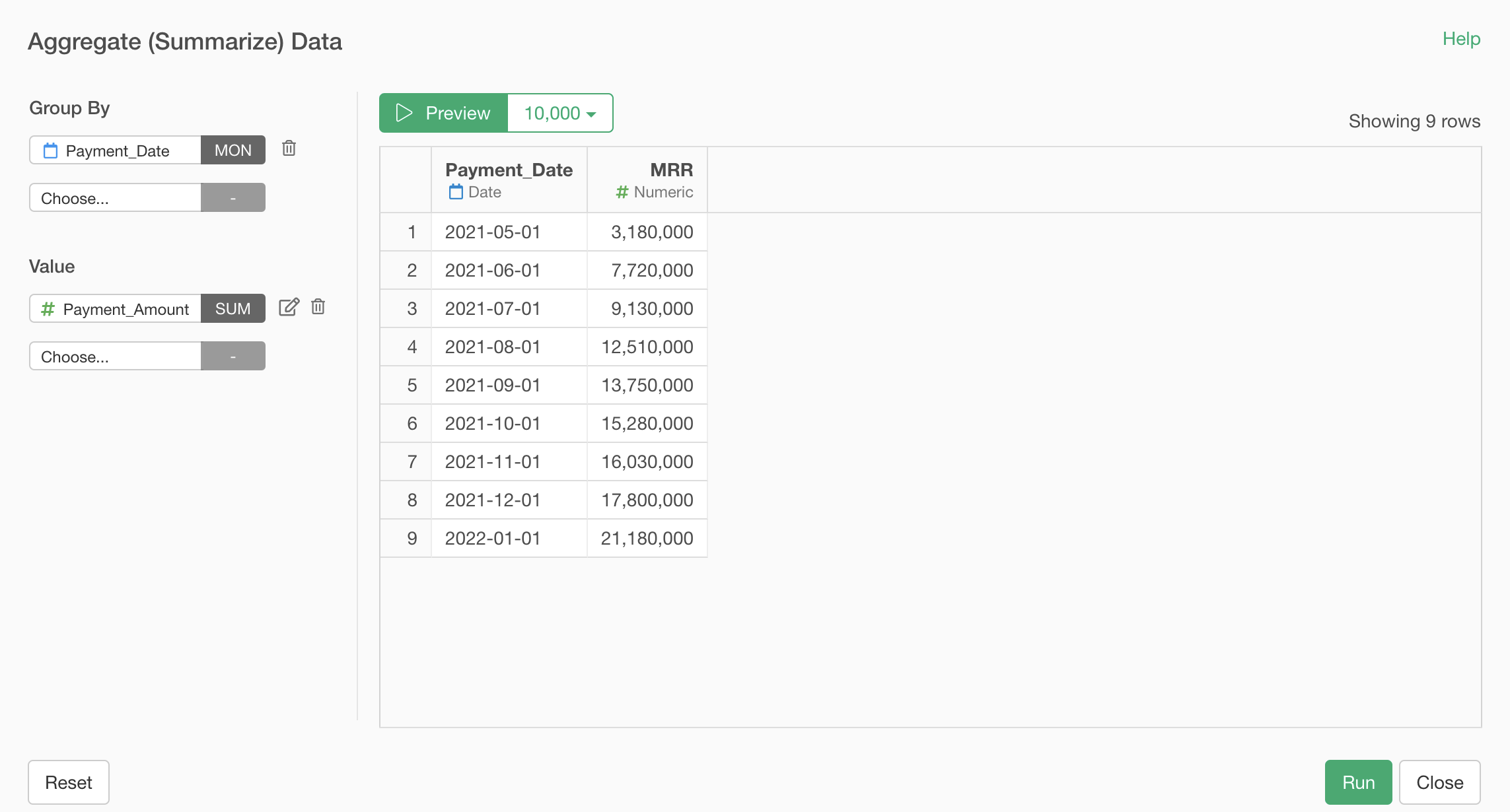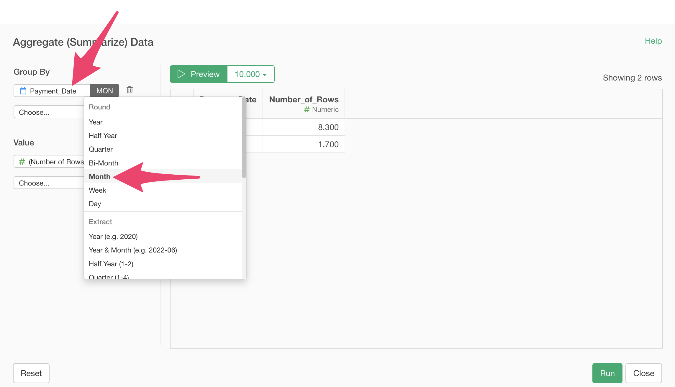 When the summarize dialog appears, select “Payment_Date” for the group and choose “Month” with truncation for the date unit. When calculating annual ARPU, select “Year” with truncation.