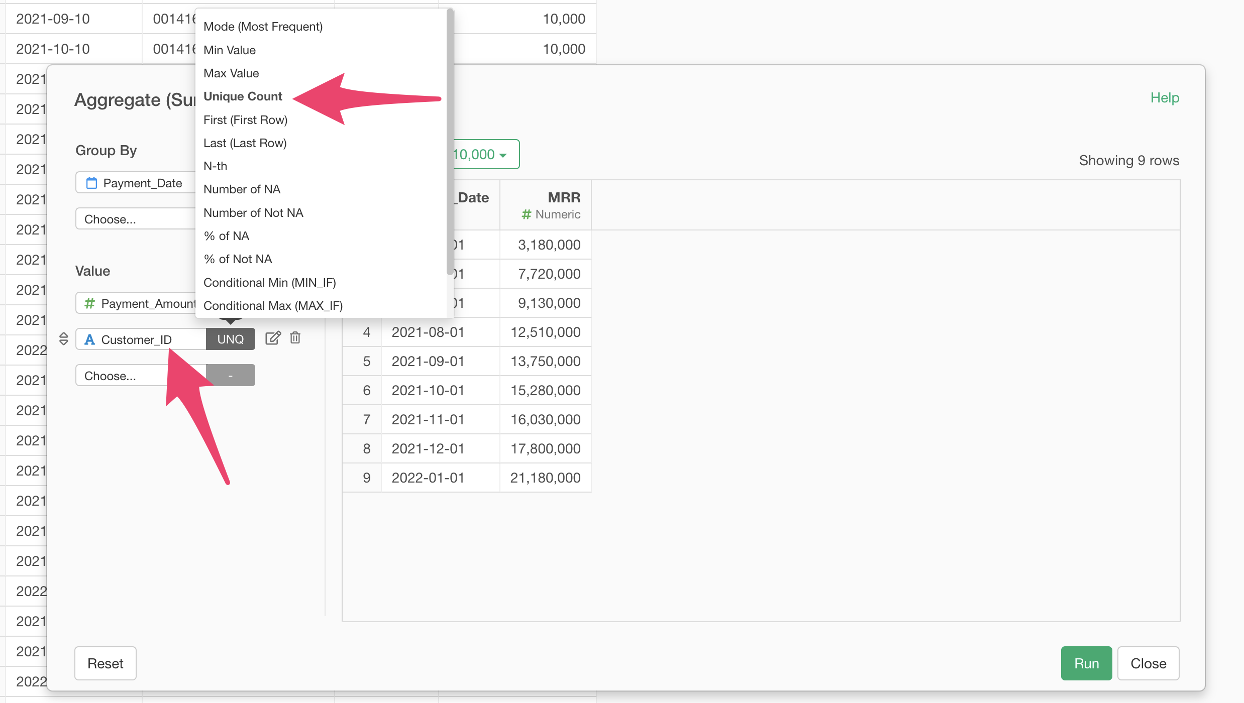 In the summarize dialog, select “Customer_ID” for the value and “Unique Count” as the aggregation function.
