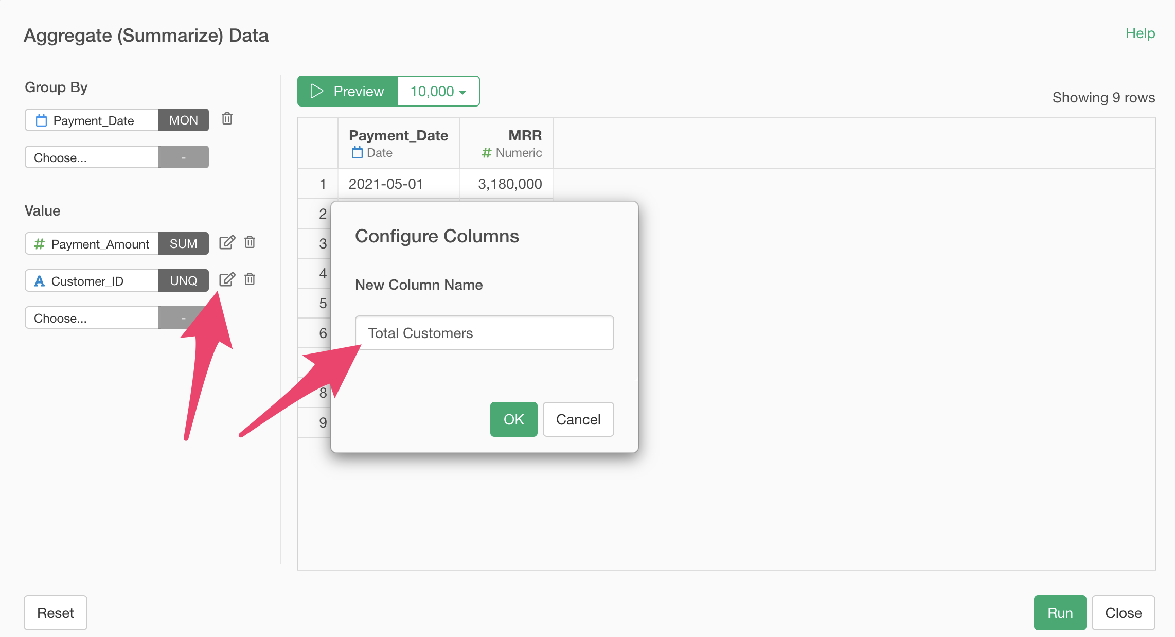 Then, click the edit icon to change the new column name to “Total Customers” and click the “Run” button.