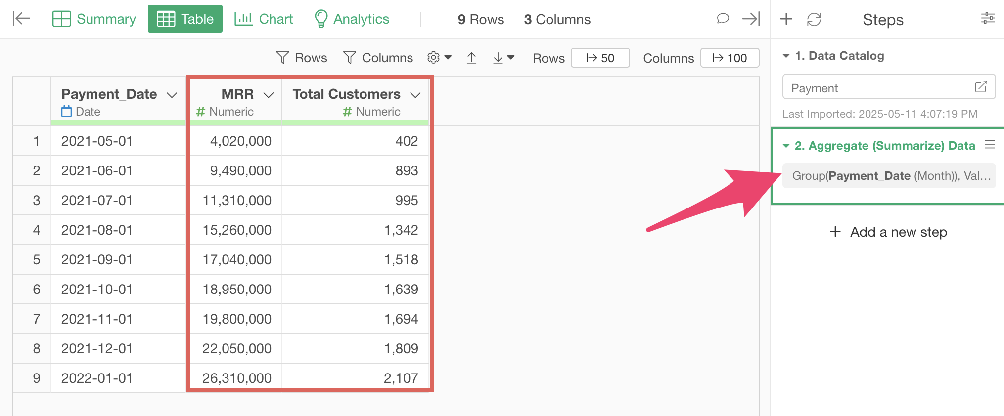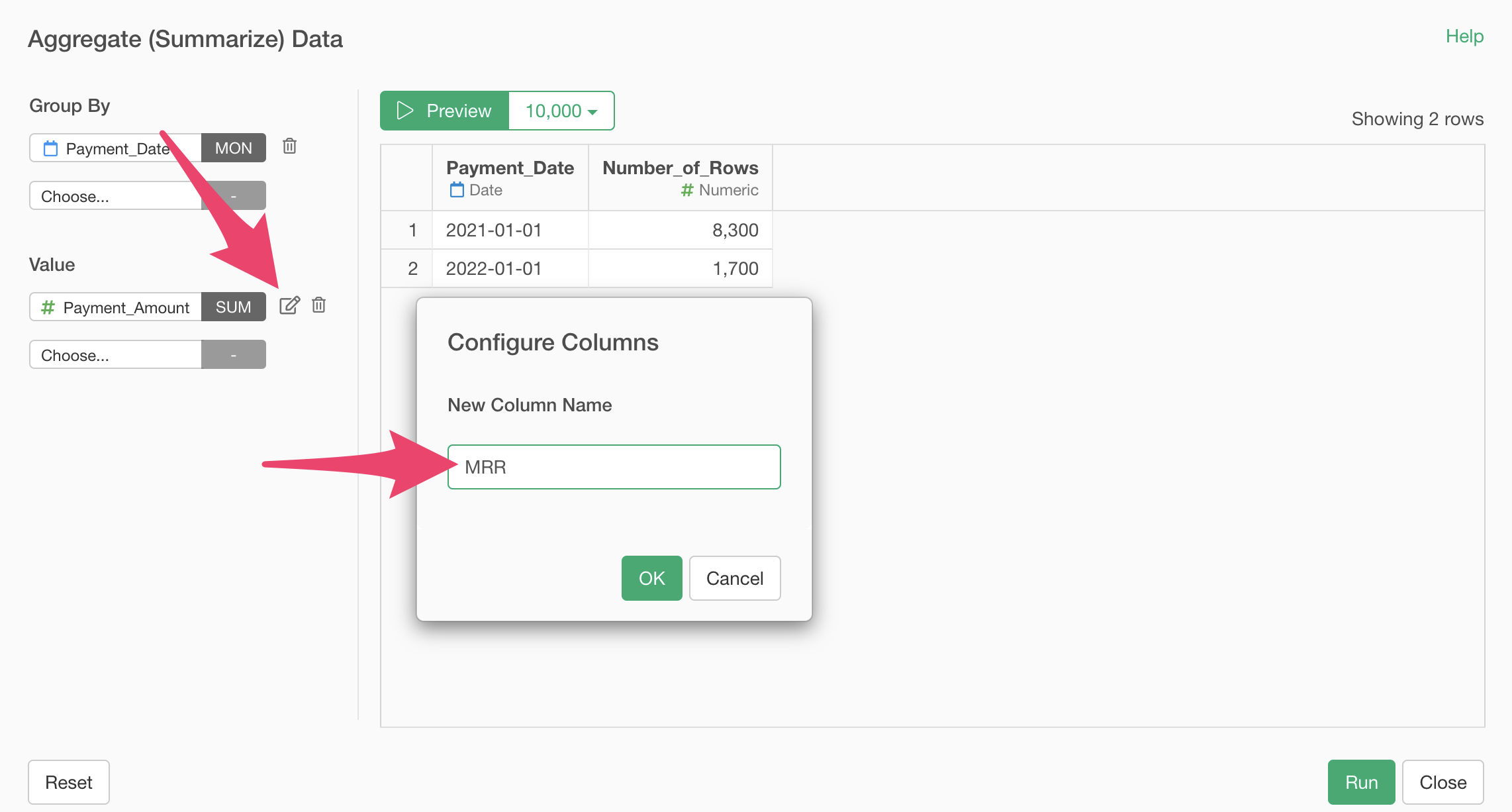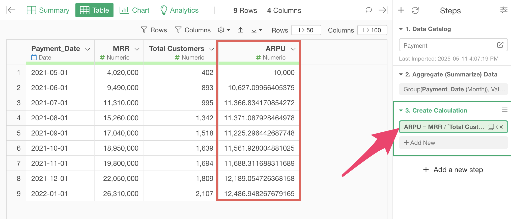 Finally, change the column name to “MRR” and click the preview button. When calculating annual ARPU, change the column name to “ARR”.