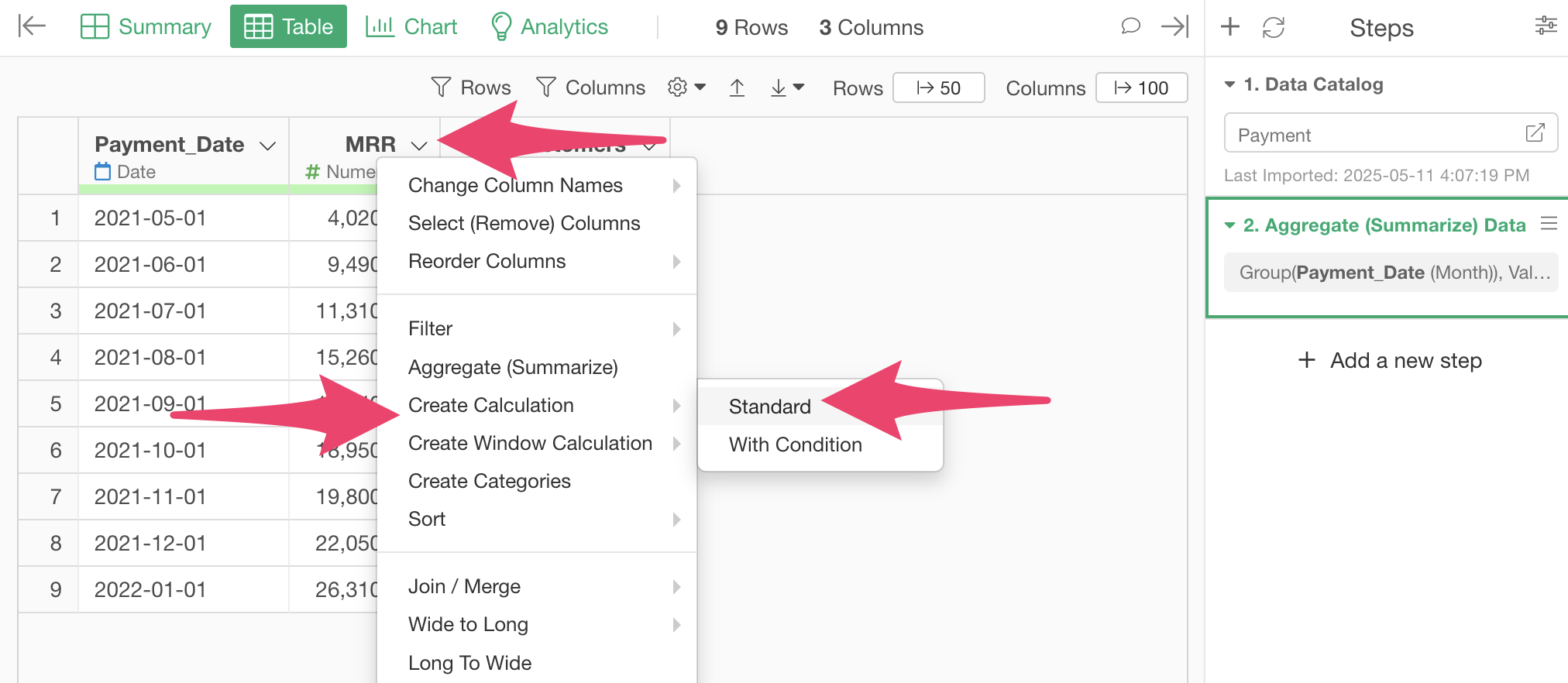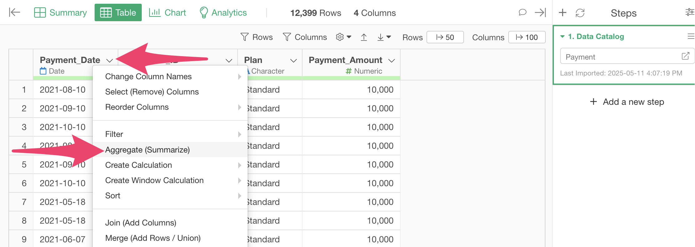 First, select “Aggregate (Summarize)” from the “Payment_Date” column header menu.
