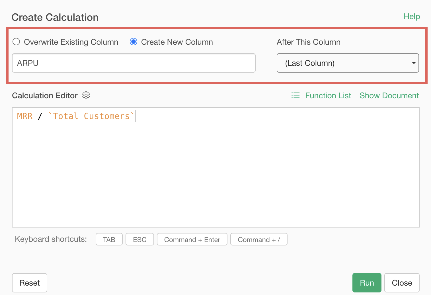 Finally, make sure “Create New column” is checked, set the column name to “ARPU”, change “After This Column” to the last column, and click the “Run” button.