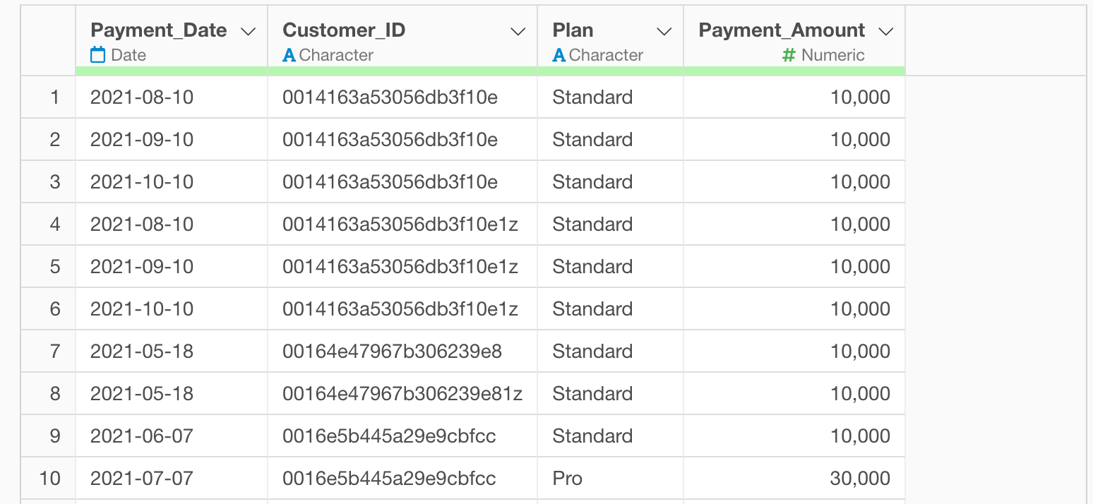 In this example, we’ll use payment data from a subscription business where each row represents one payment transaction, including Customer_ID, Payment_Date, Payment _Amount, and other information. (You can download the data from this page)