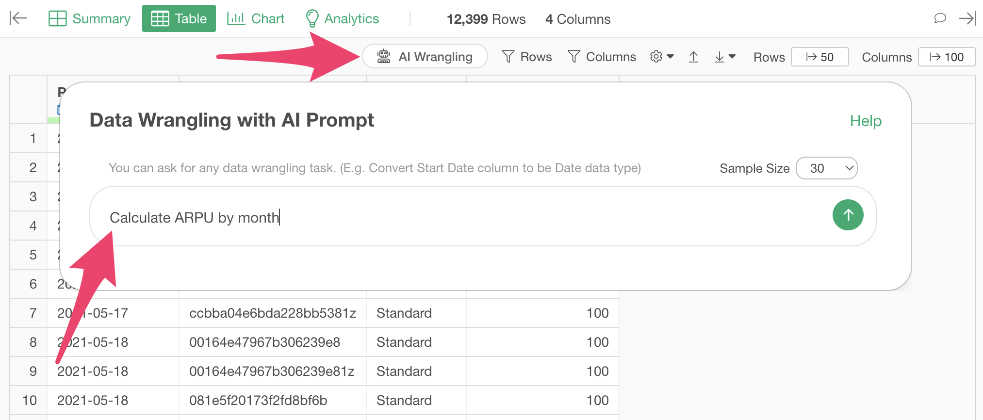 Click the “AI Wrangling” button. When the AI Prompt dialog appears, enter a prompt like the one below and run it: