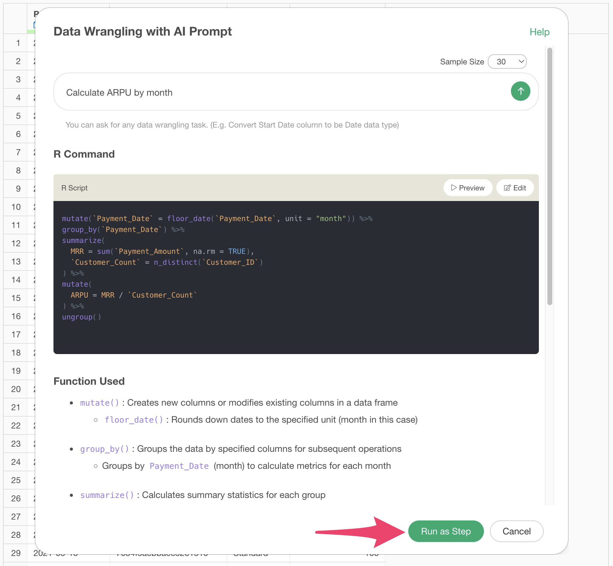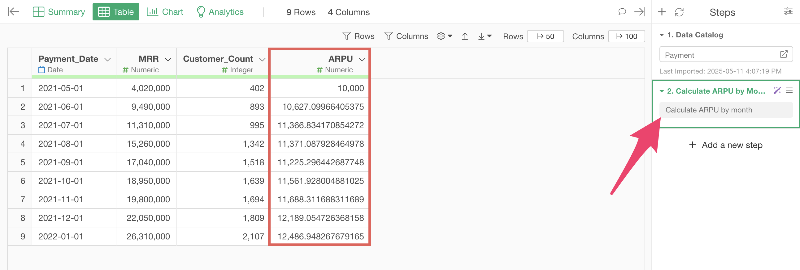 The code to calculate ARPU will be generated. Check the results and click the “Run as Step” button.