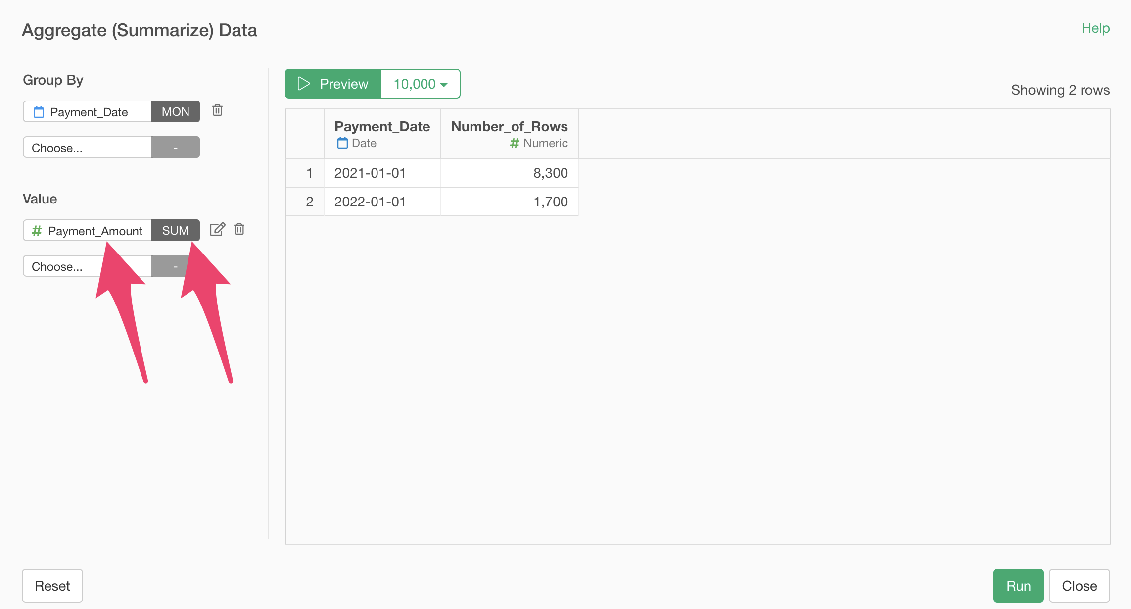 Next, select “Payment_Amount” for the value and SUM as the aggregation function.