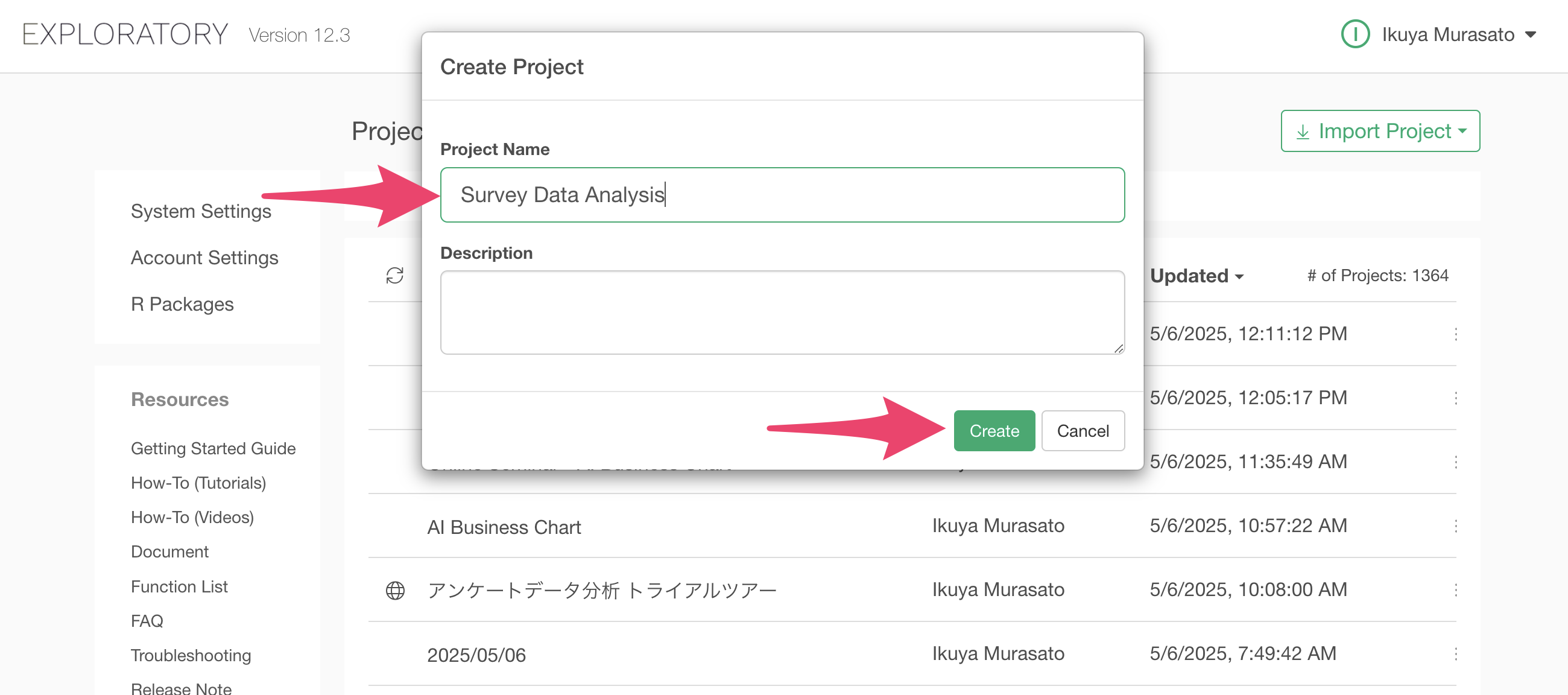 A dialog to create a project will appear. Enter a name of your choice and click the create button.