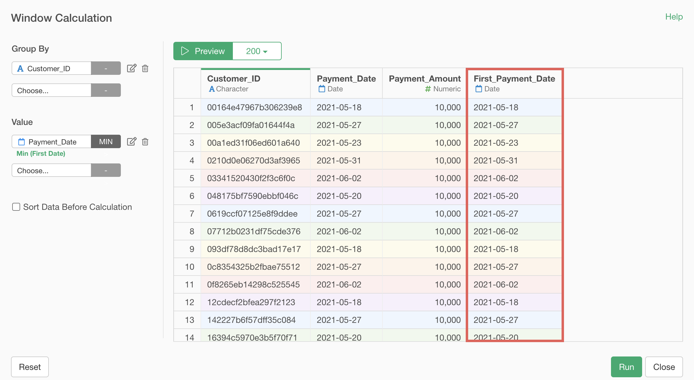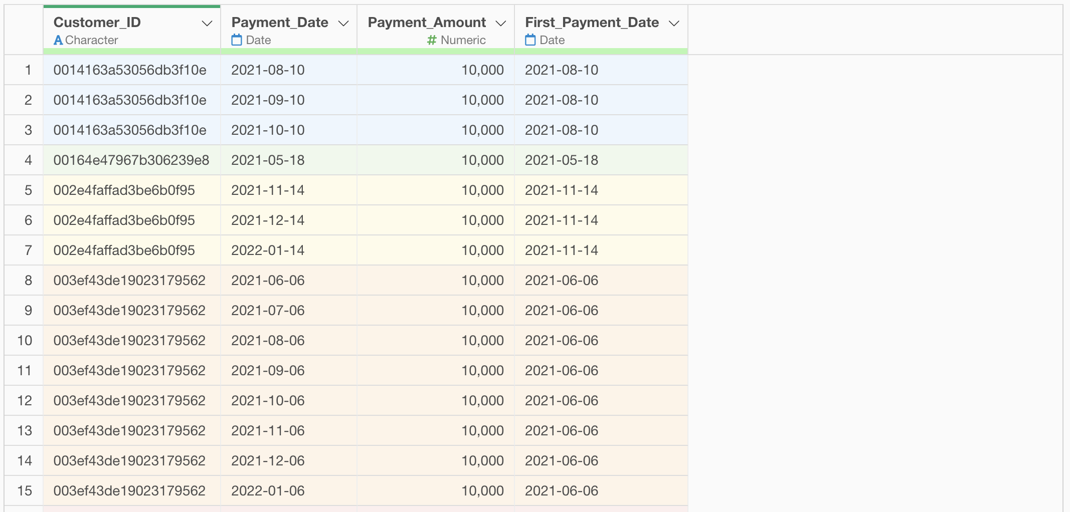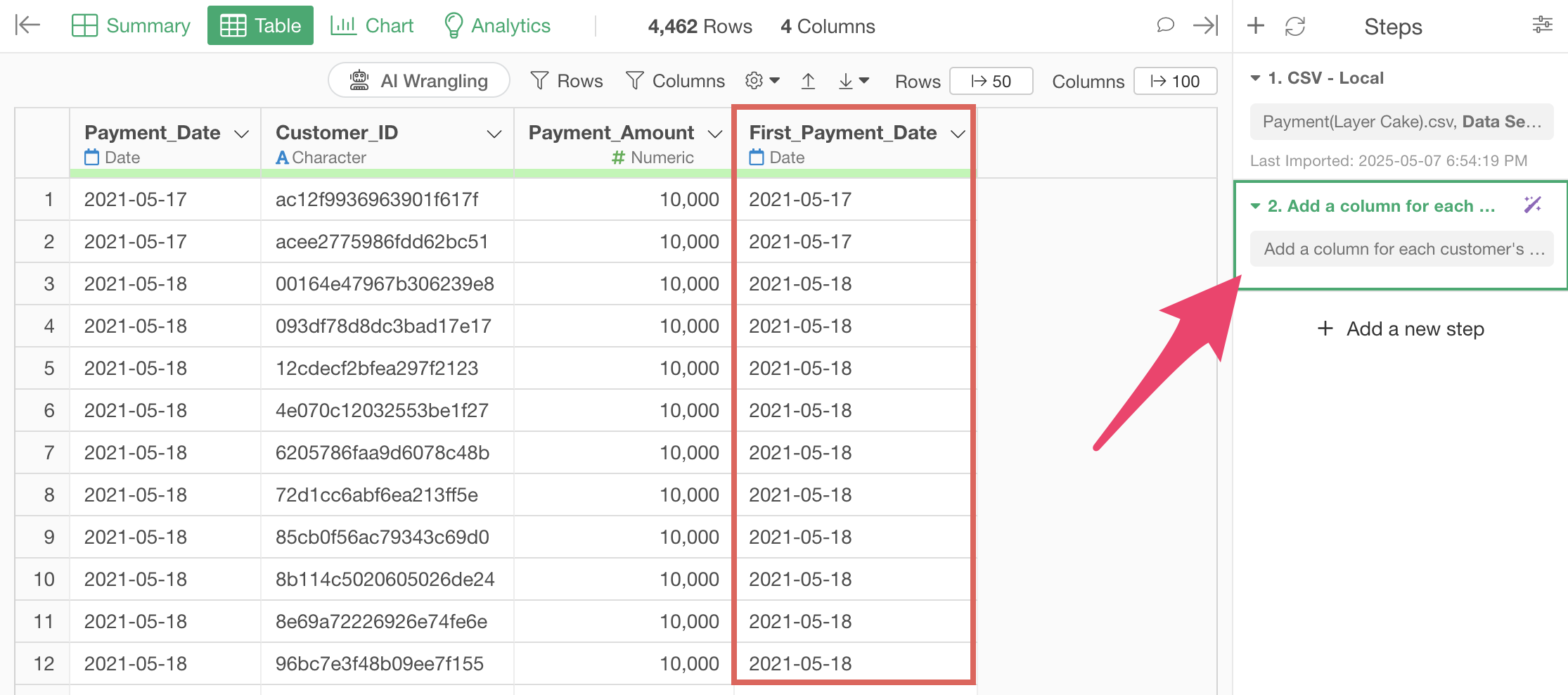 In the following section, we’ll introduce how to add a column for the first payment date for each customer using the “UI”. If you’ve completed this process, please proceed to the “Creating a Layer Cake Chart” section.