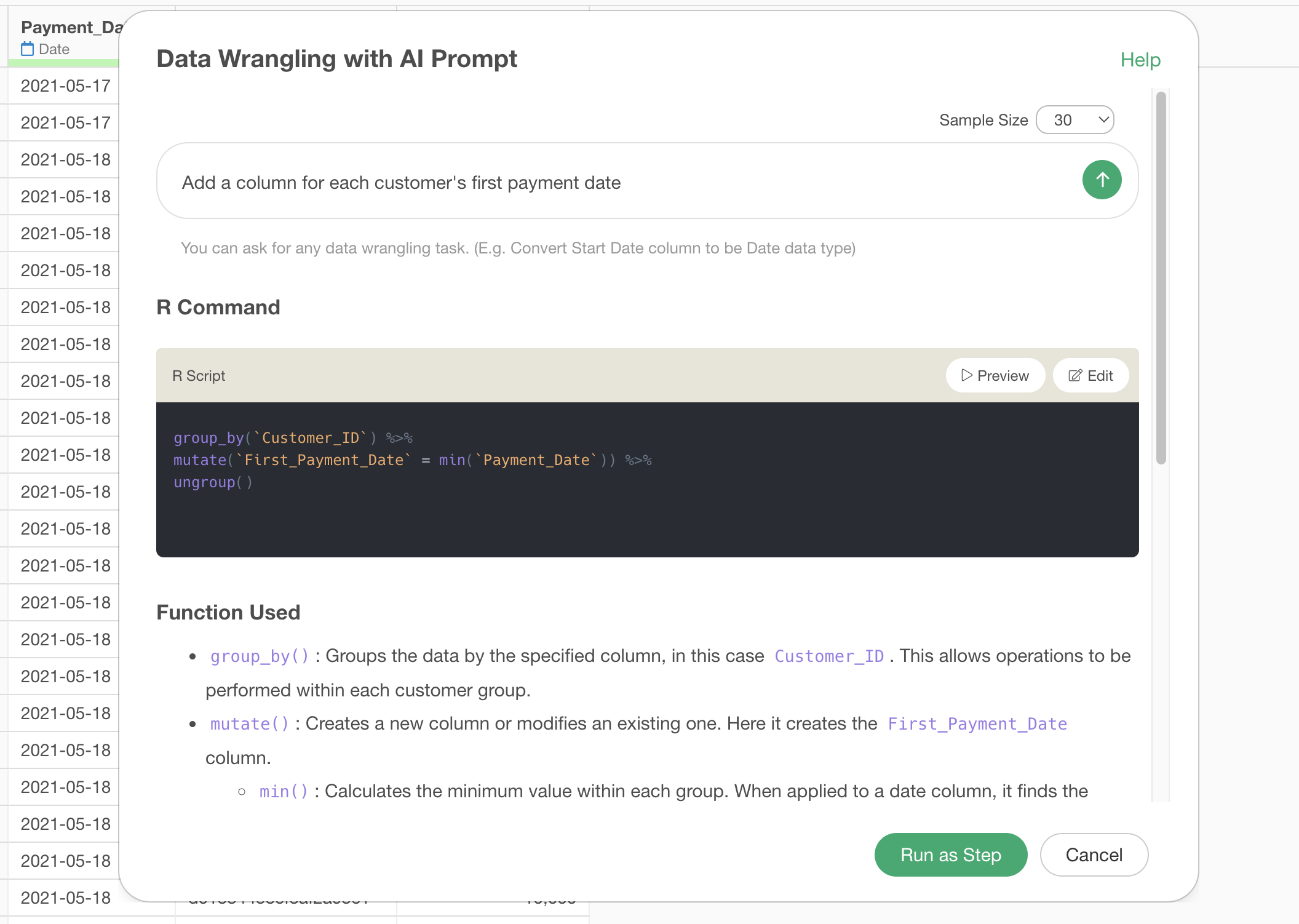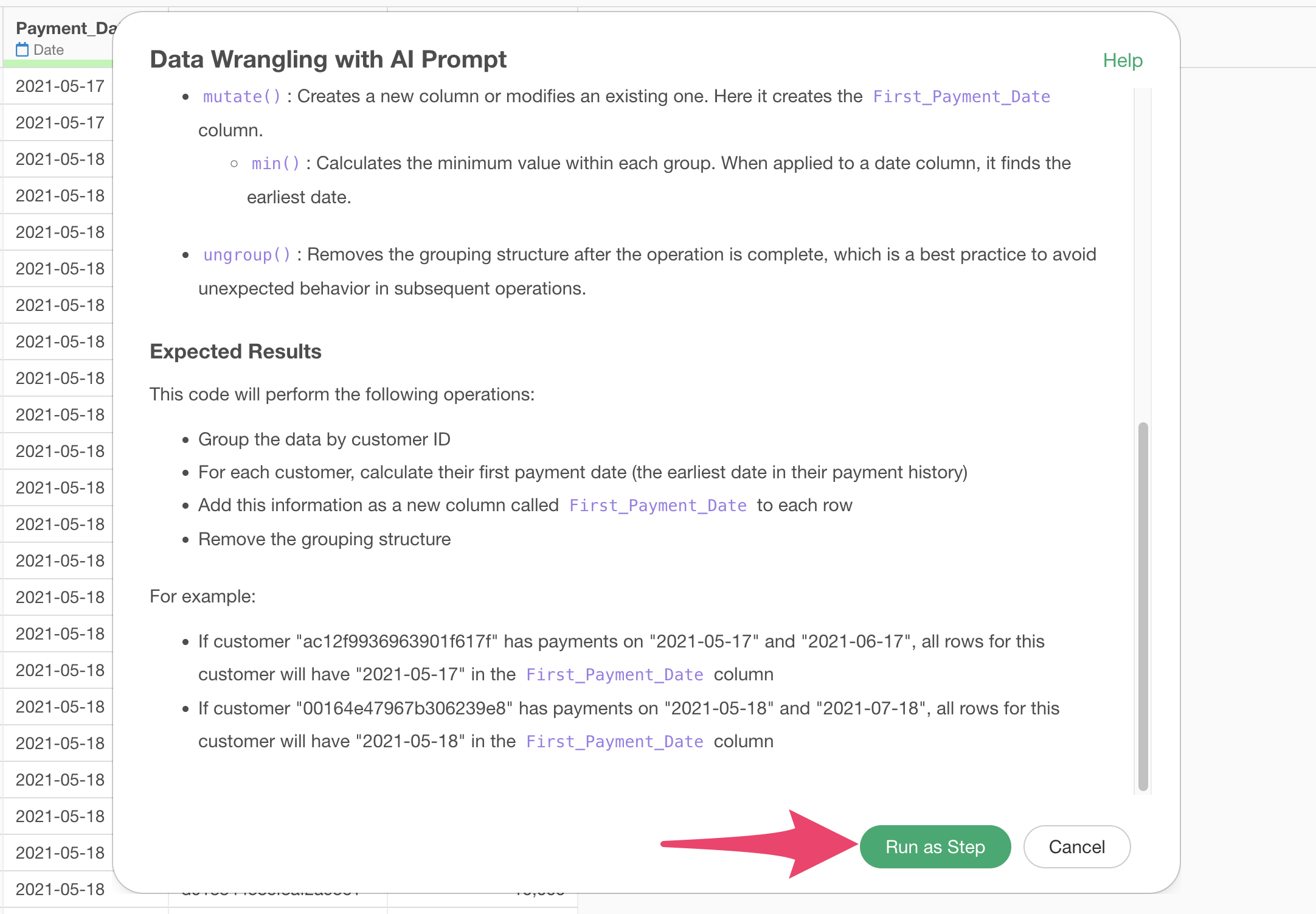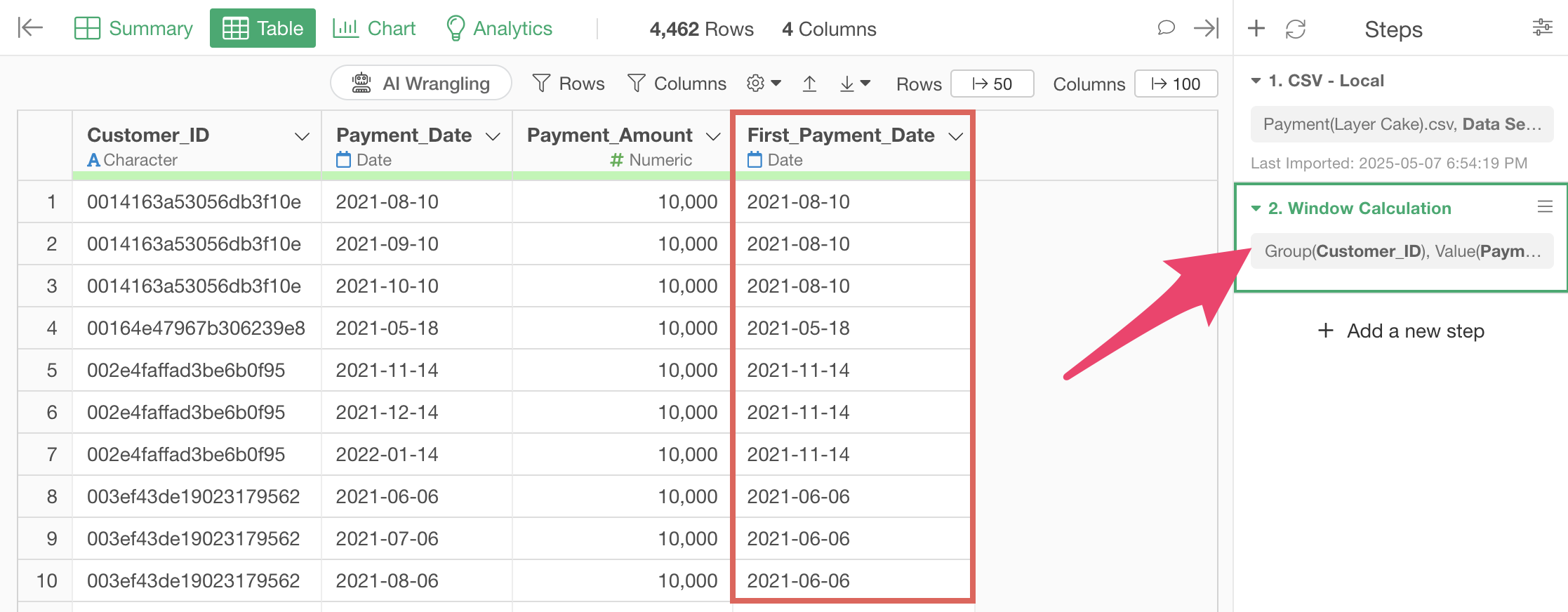 The step has been added, and you’ve successfully added a column for the first payment date for each customer.