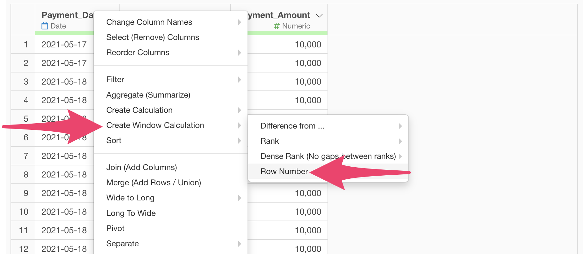 Since we want to calculate the “first payment date” for each customer, select any menu (in this case, “Row Number”) from the “Create Table Calculation” in the column header menu of “Payment Date”.