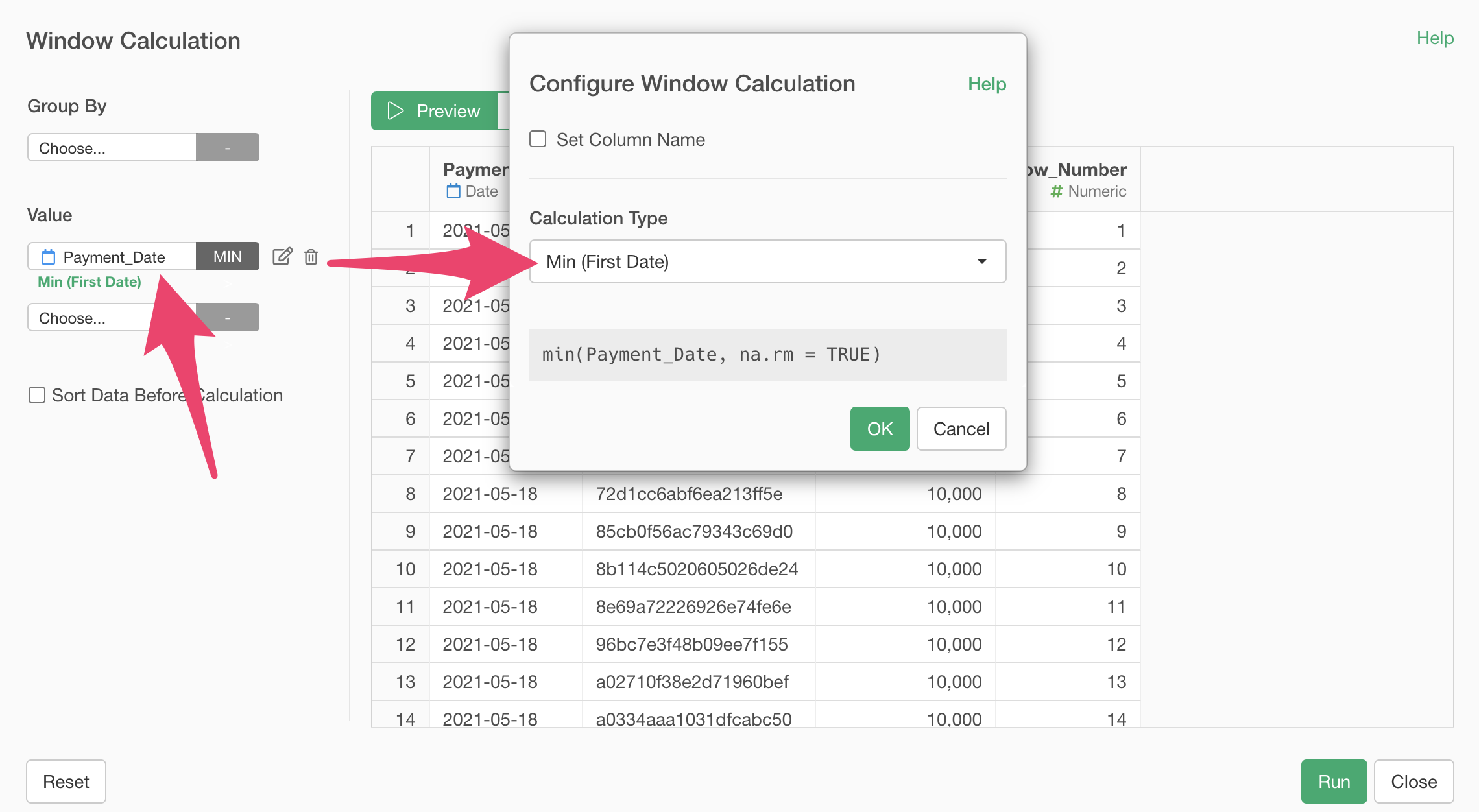 When the table calculation dialog appears, select “Payment_Date” for the value and “Min(First Date )” for the calculation type.