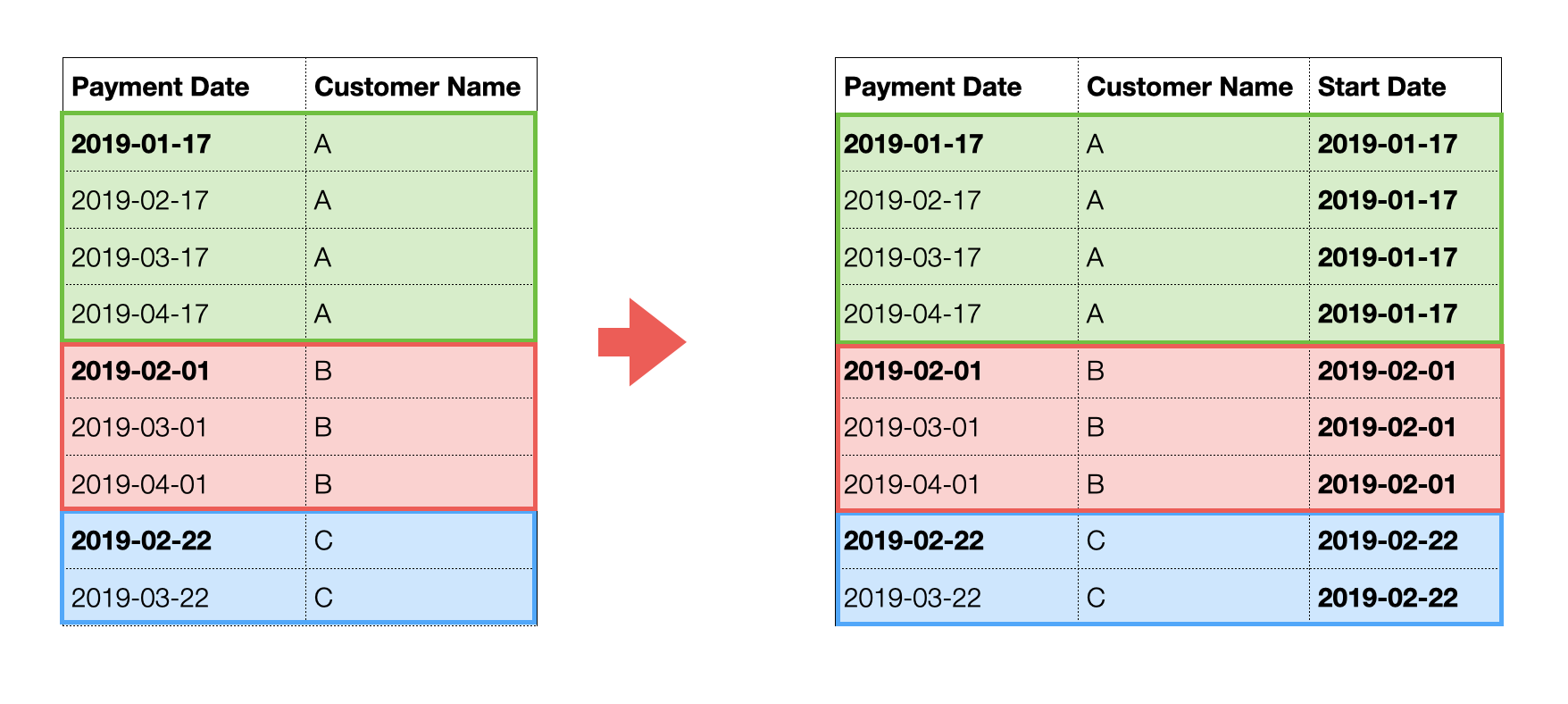 In this case, we want to calculate the first payment date “for each customer” and divide them into groups by start date (month) as shown below.