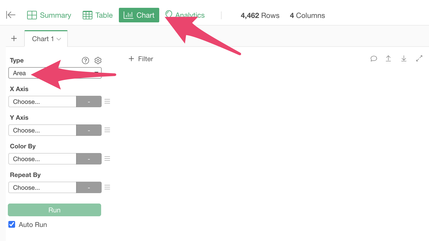 Now that the data is prepared, let’s create a Layer Cake Chart. Move to the chart view and select “Area” as the chart type.