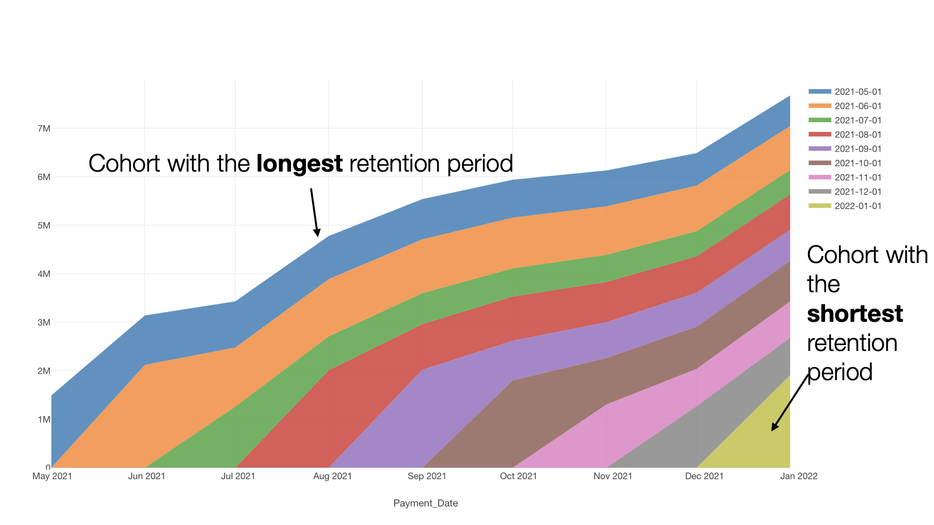 A Layer Cake Chart is a visualization that shows the progression of MRR (Monthly Recurring Revenue) for each customer group, color-coded by their “service start period”.