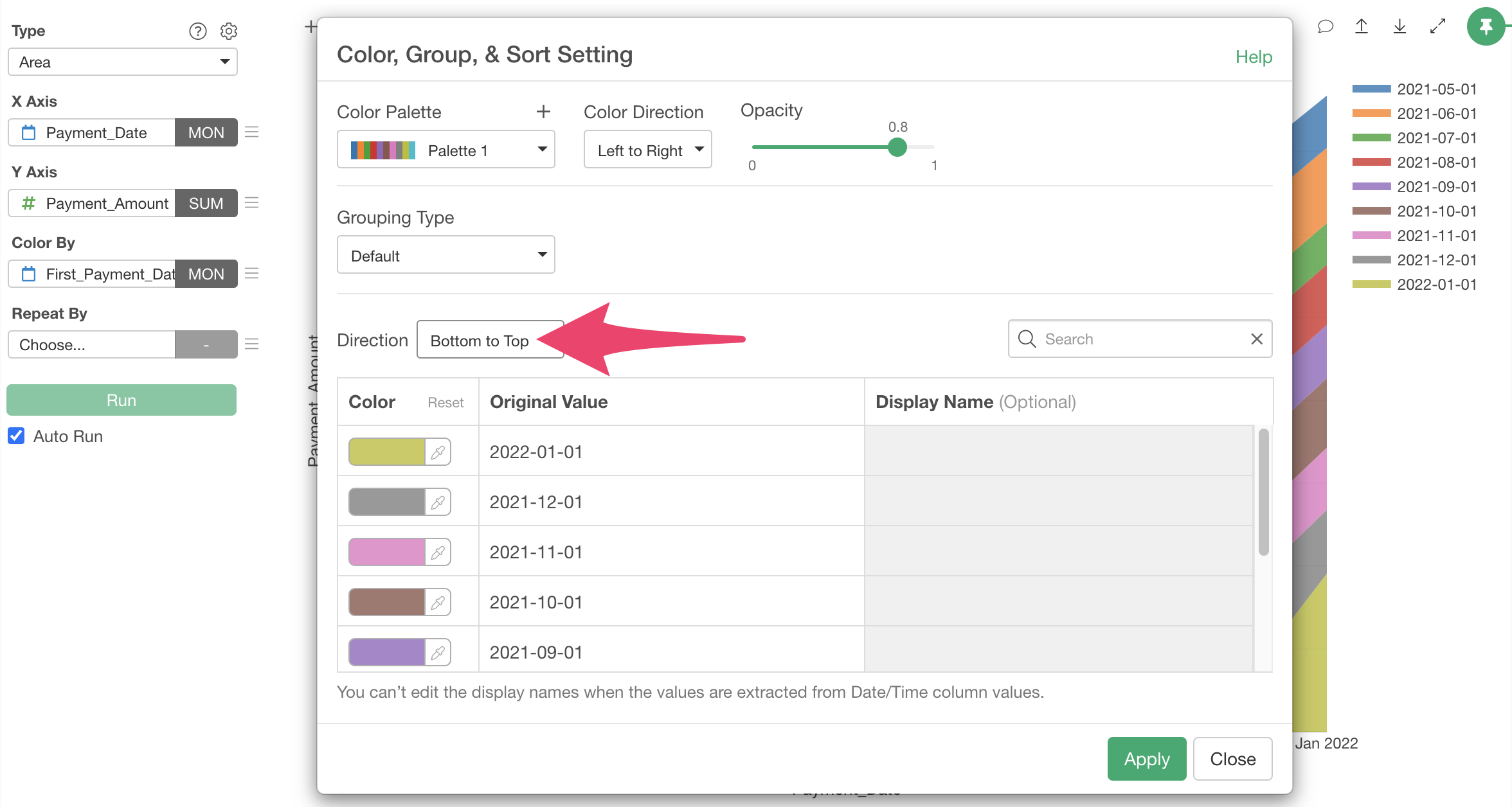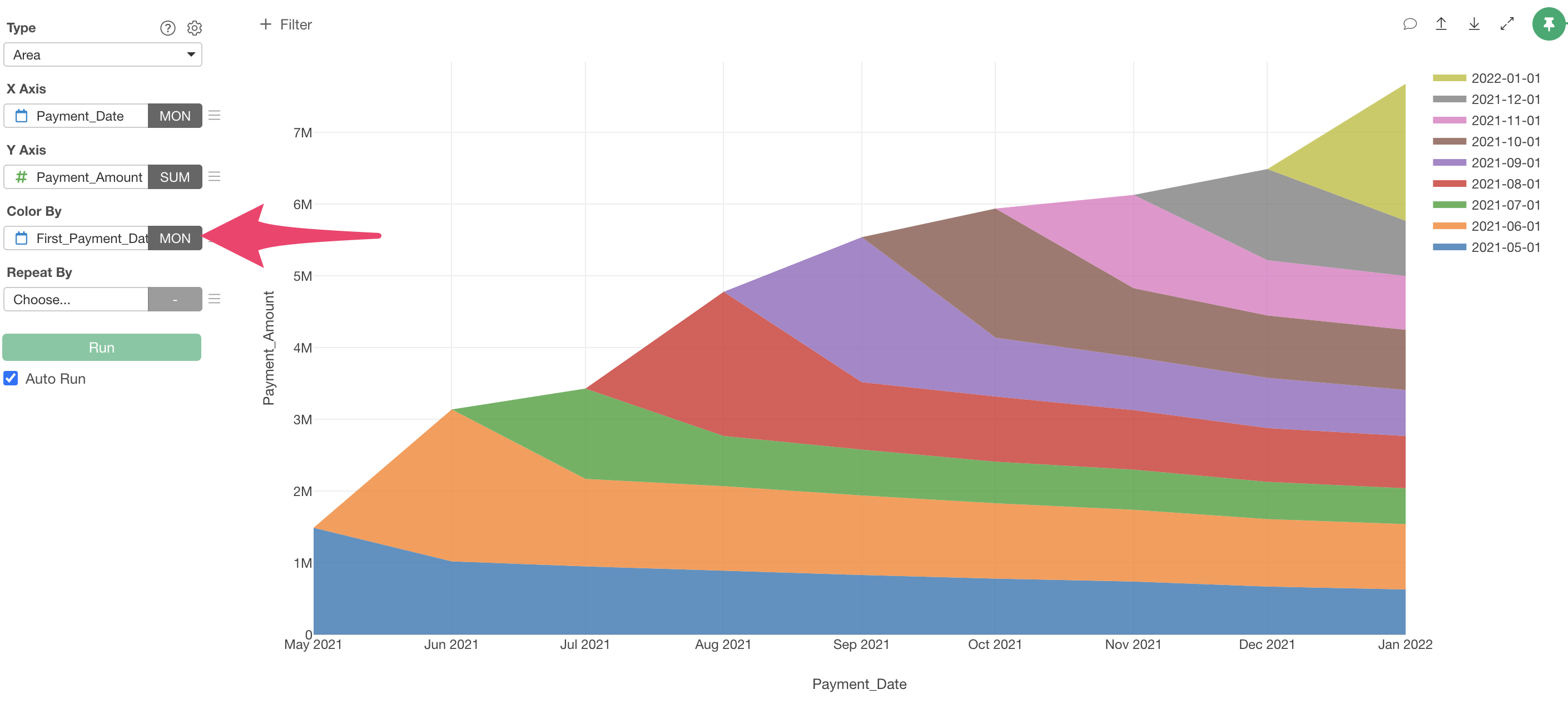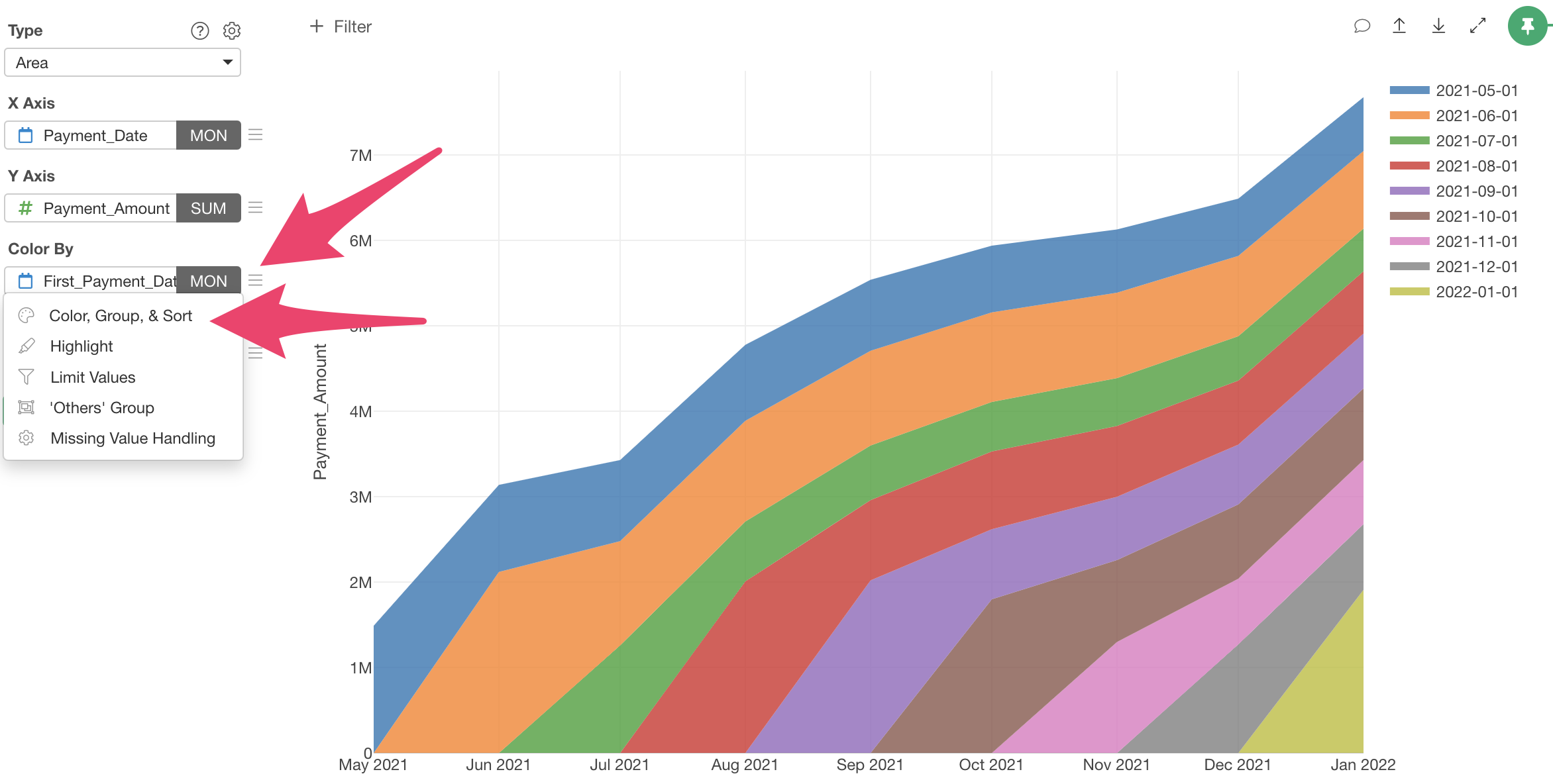 In a Layer Cake Chart, MRR is stacked starting with cohorts that have longer continuation periods.Therefore, select “Color, Group, Sort” from the “Color By” menu to change the color order.