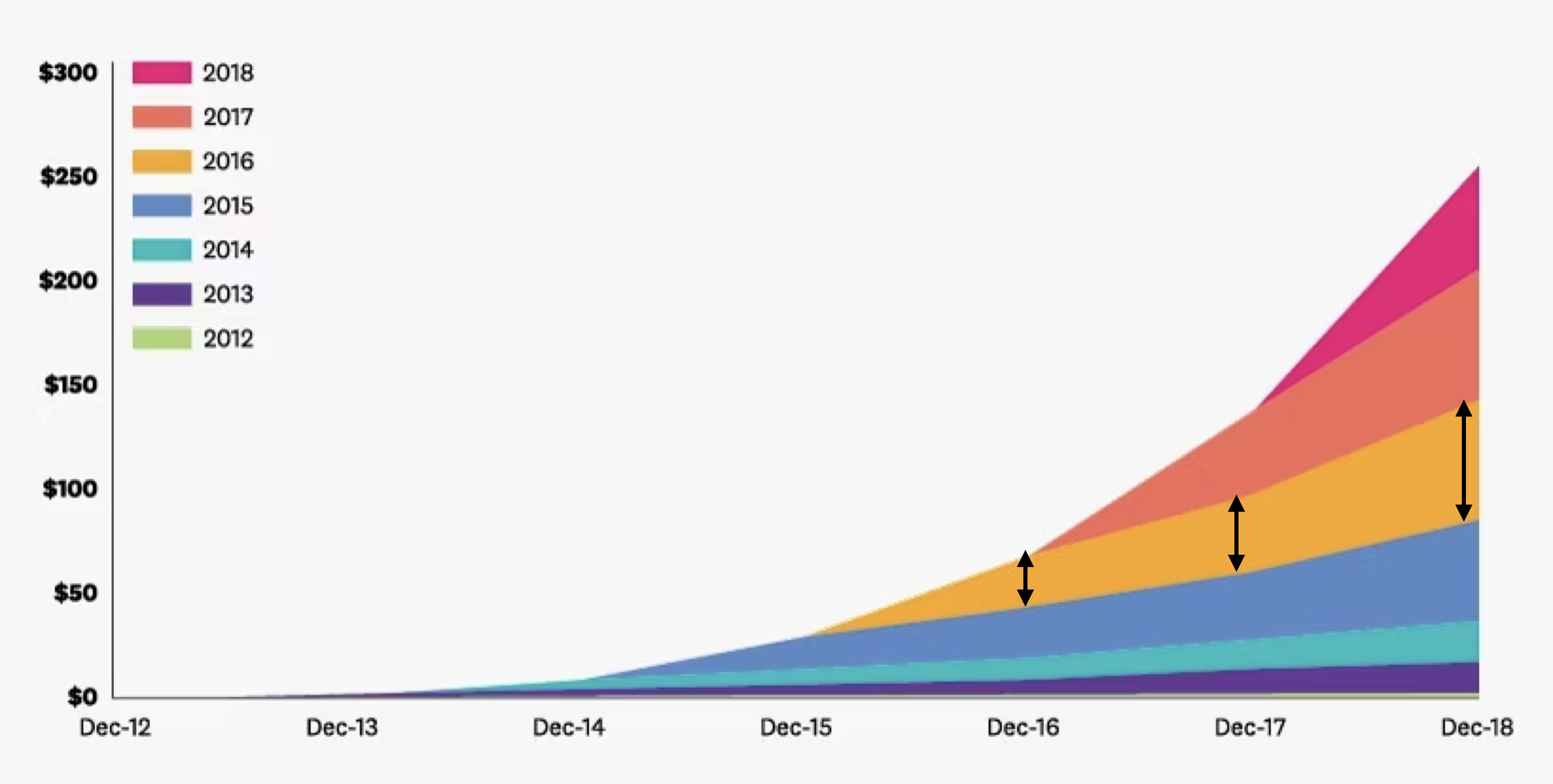 For example, below is a Layer Cake Chart from Datadog, a SaaS service provider. This chart clearly shows an enviably efficient business growth at a glance.
