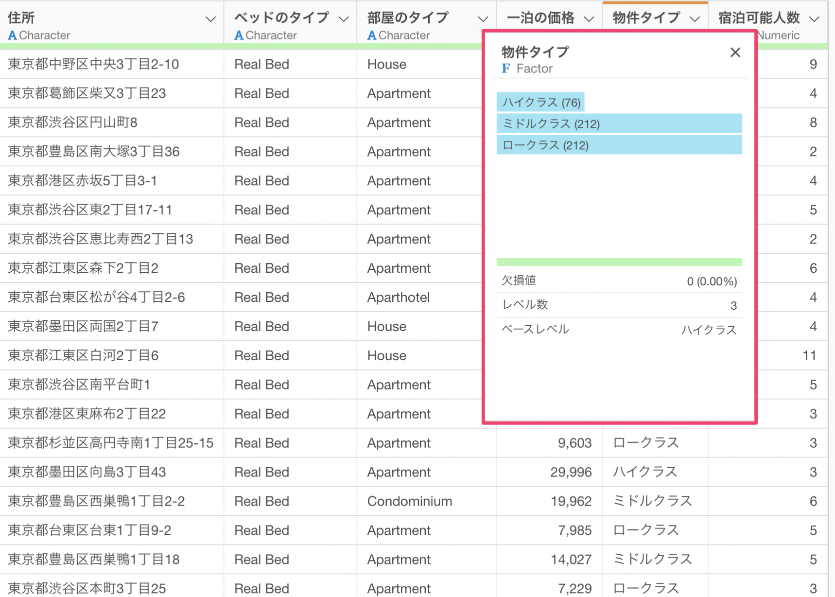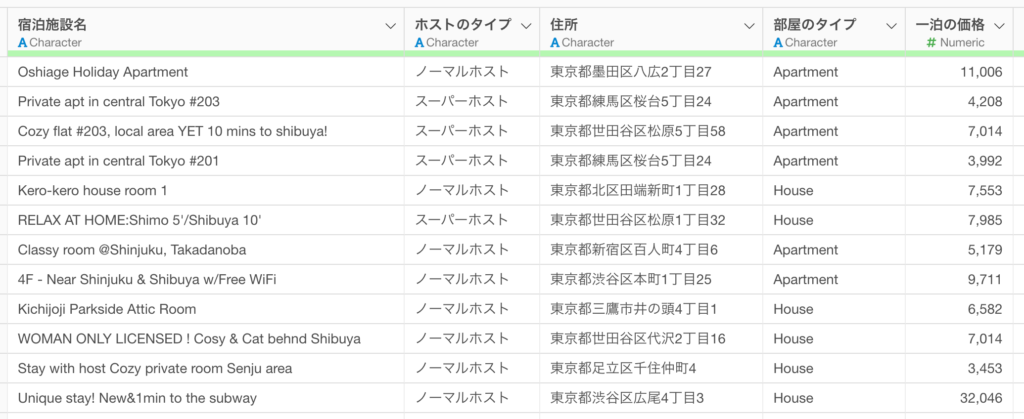 例えば以下のように1行1つの民泊の物件を表すデータがあったとします。