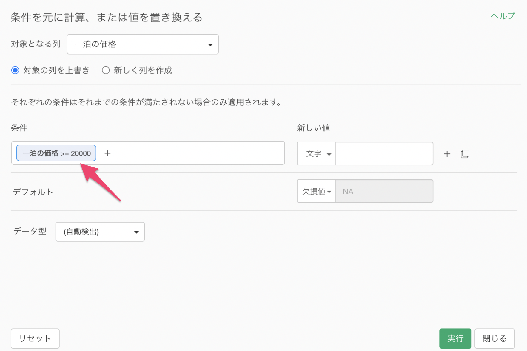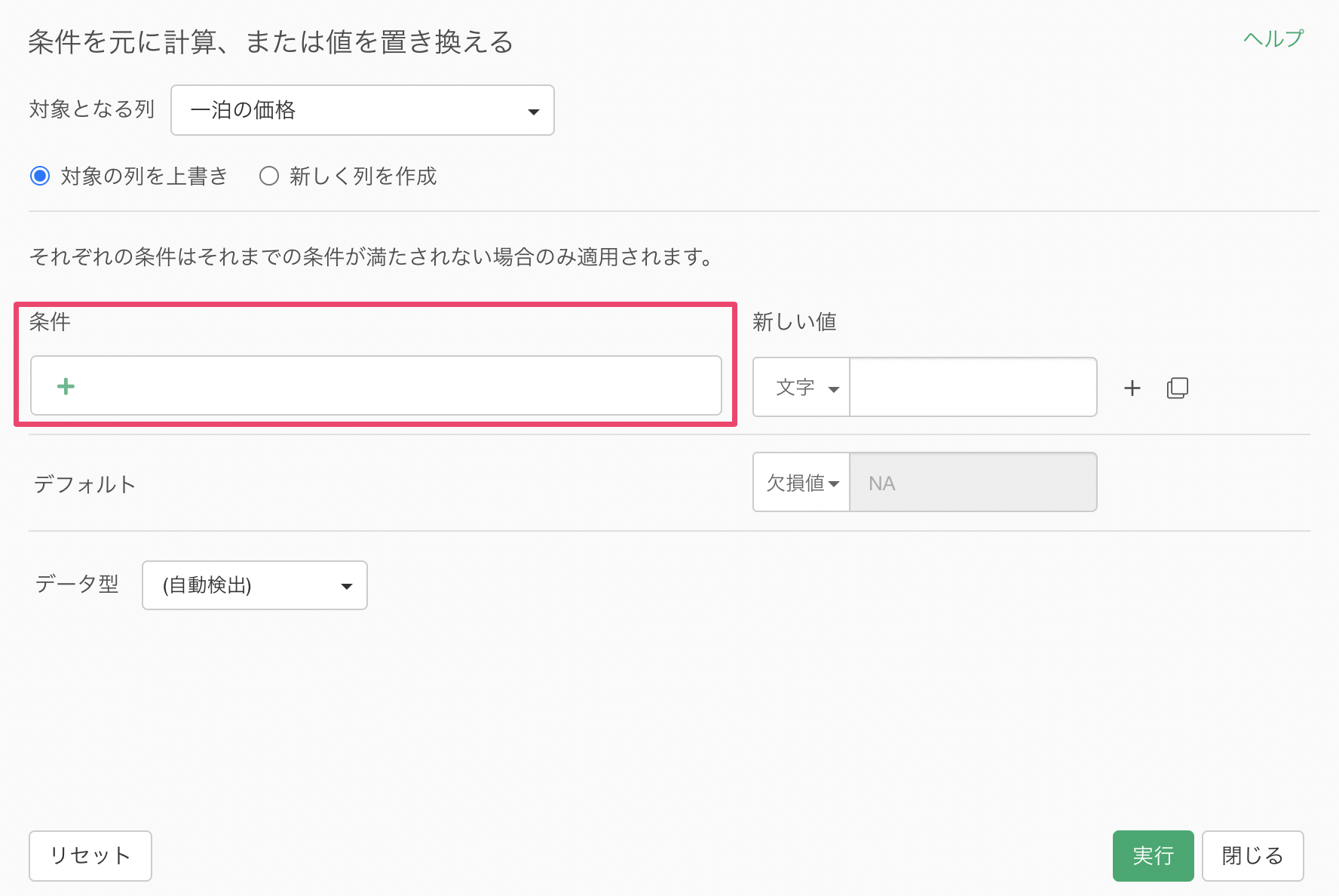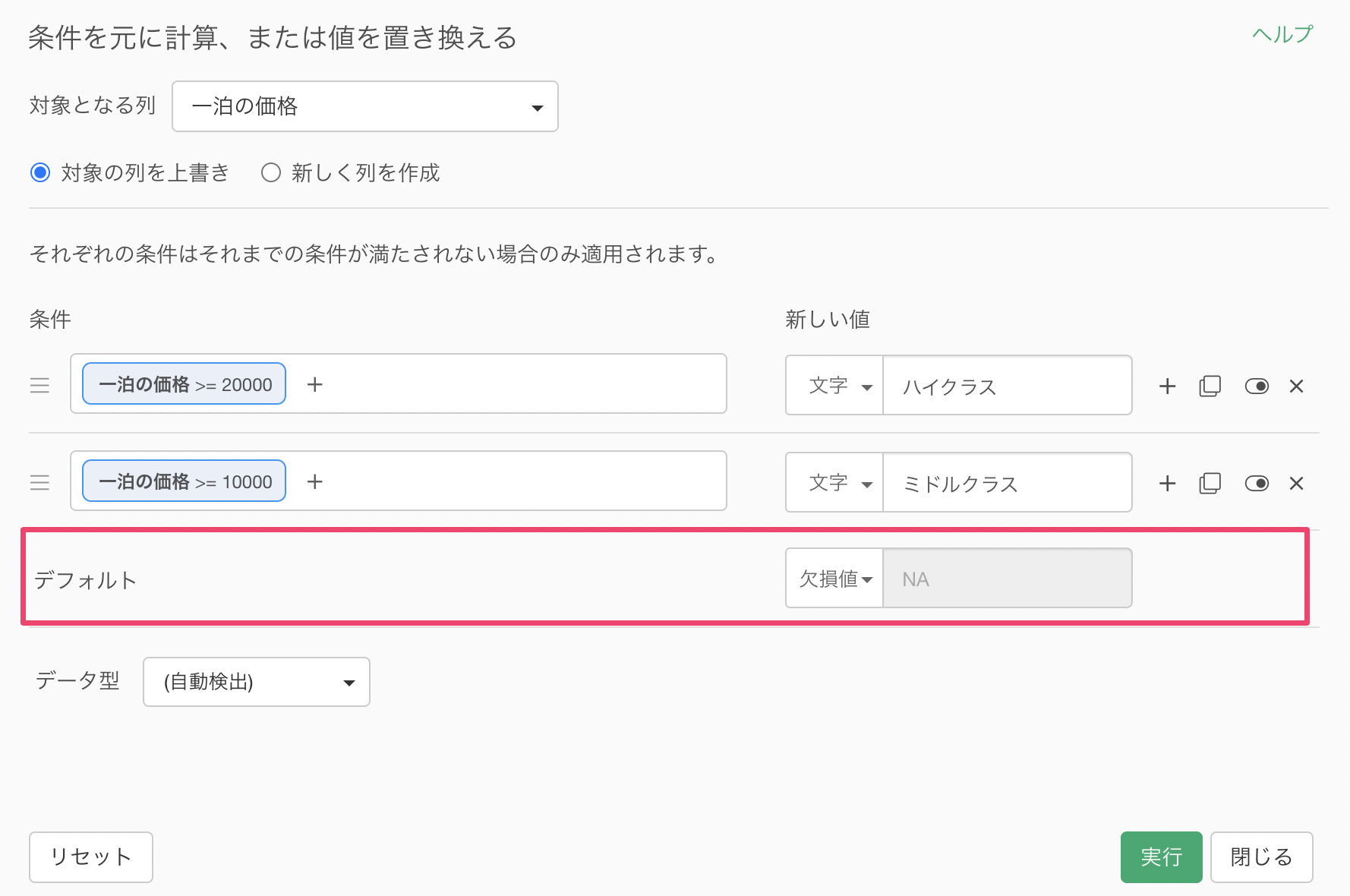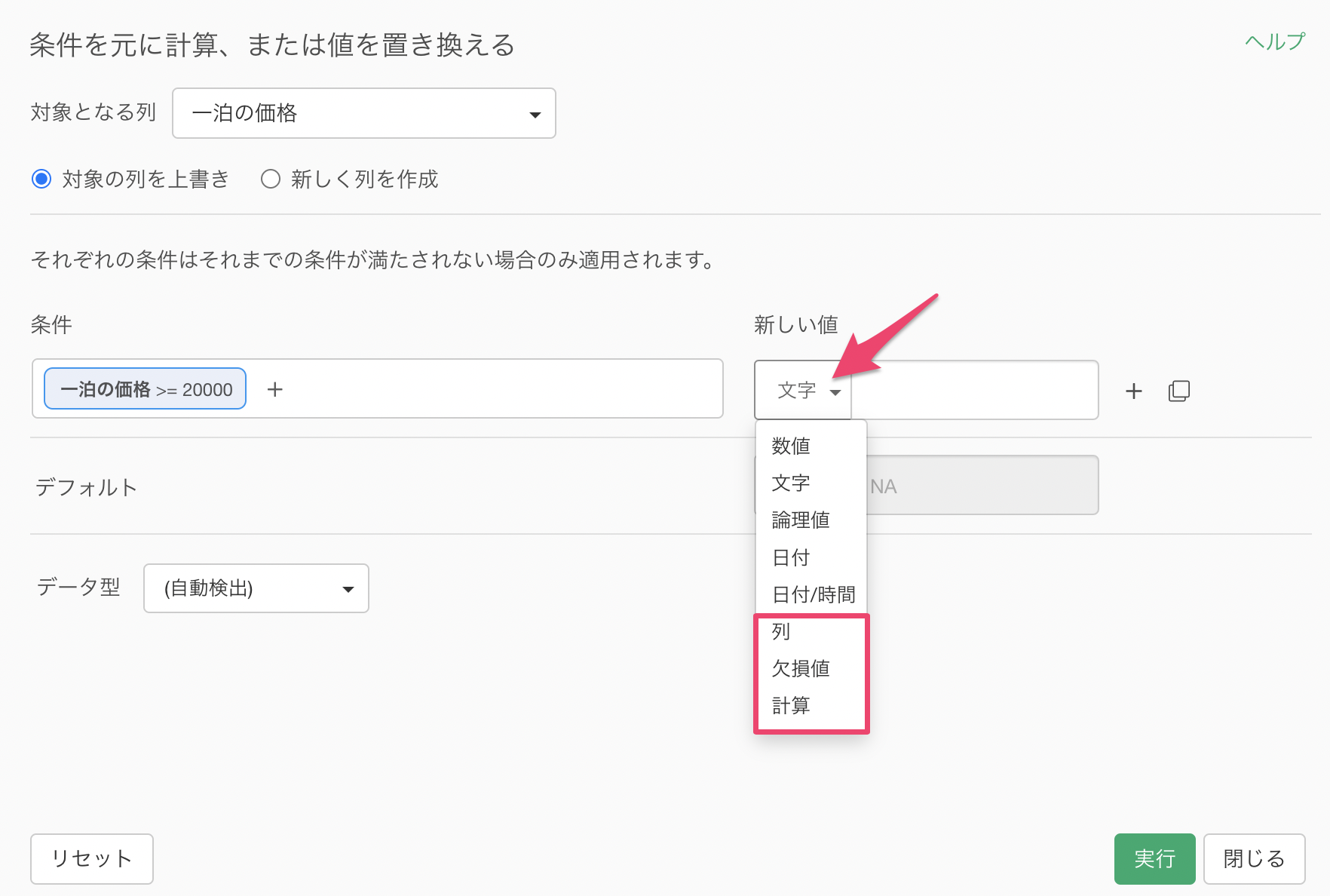 欠損値を選択すると、条件に合致した行に対して、指定した計算の結果を返します。