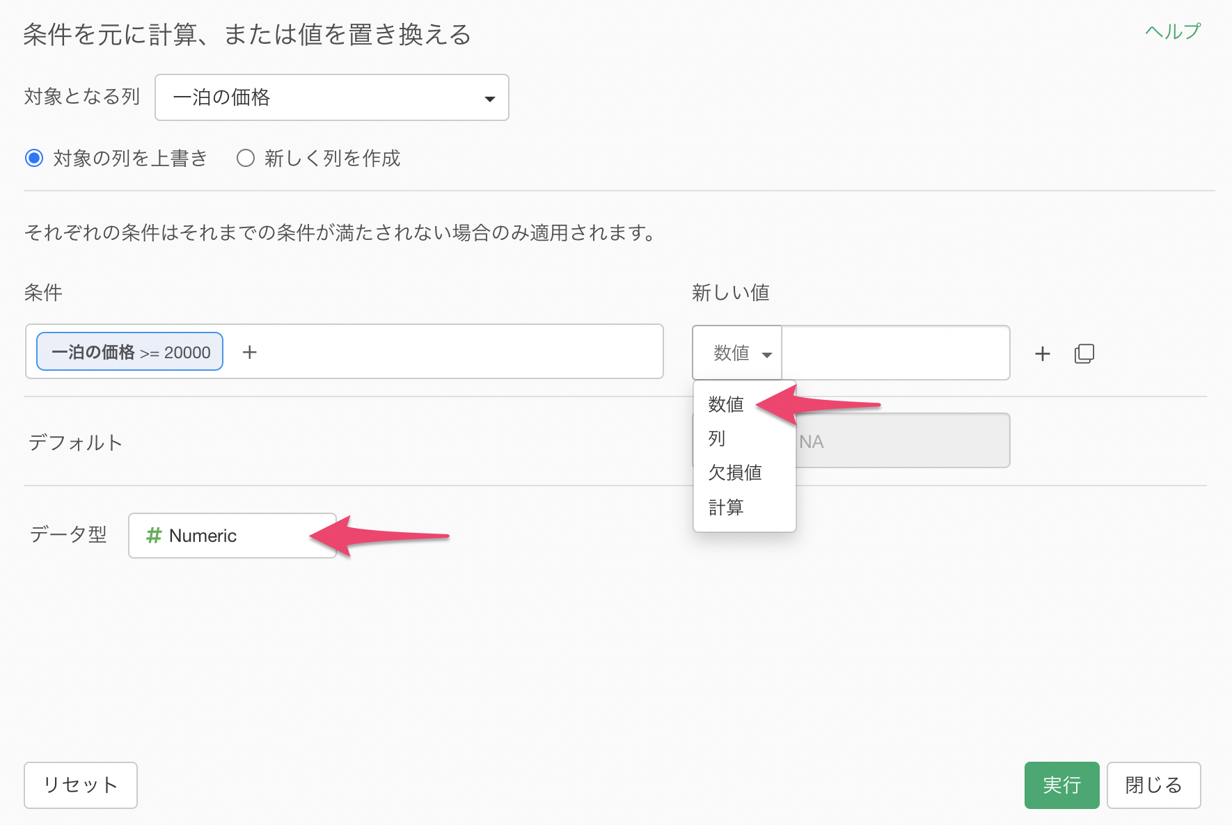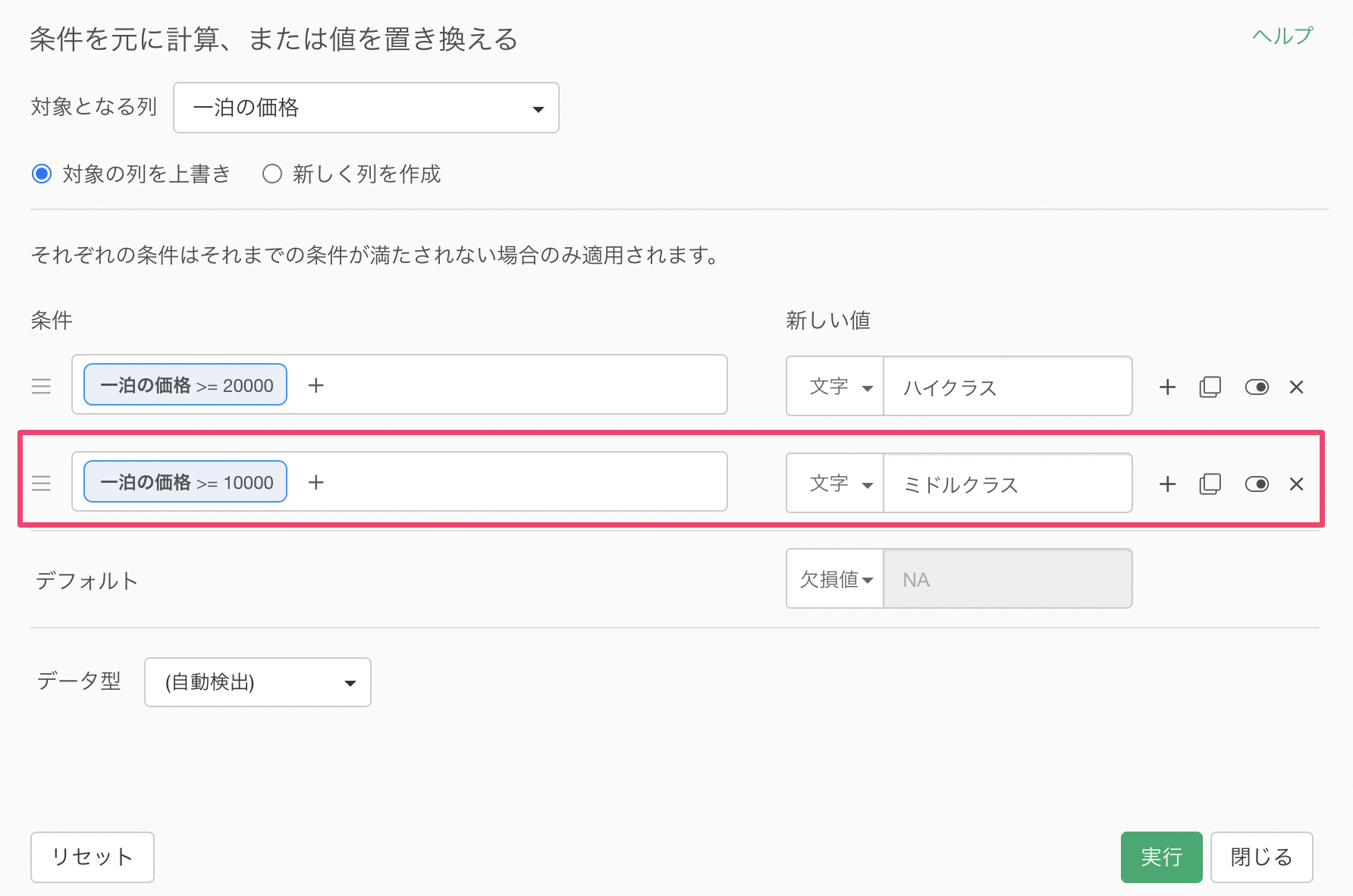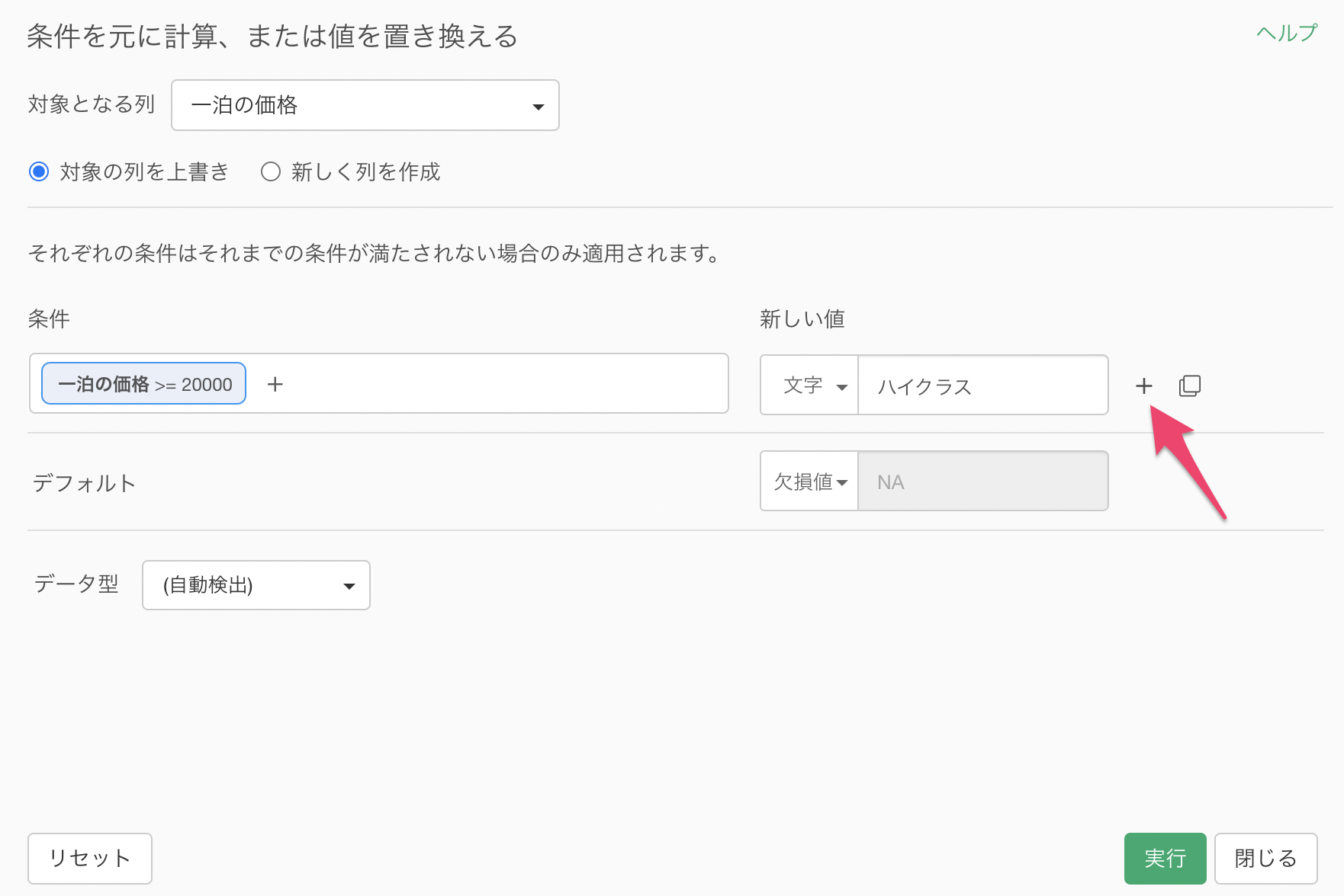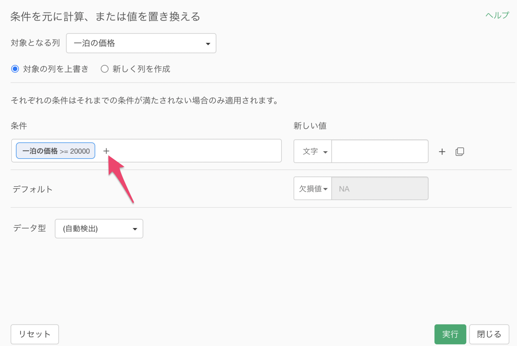 欠損値を選択すると、条件に合致した行に対して、指定した計算の結果を返します。