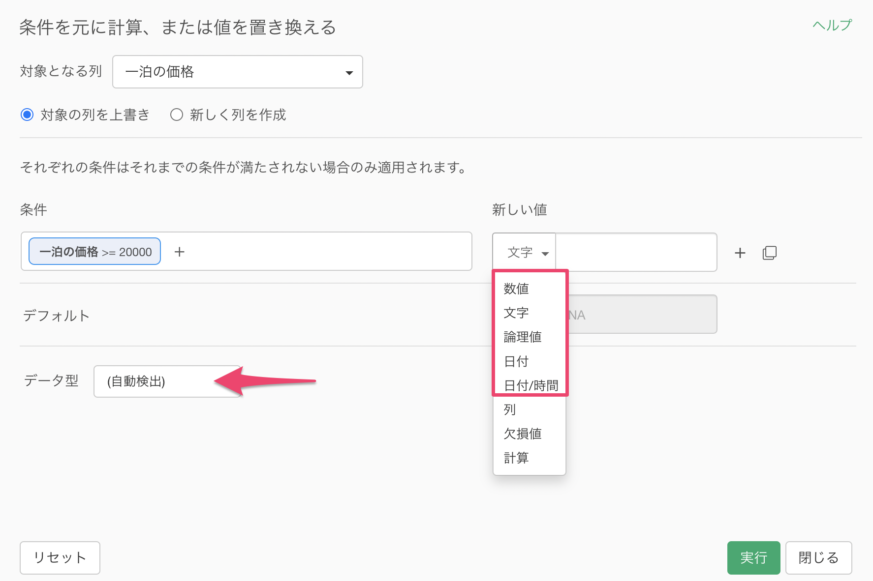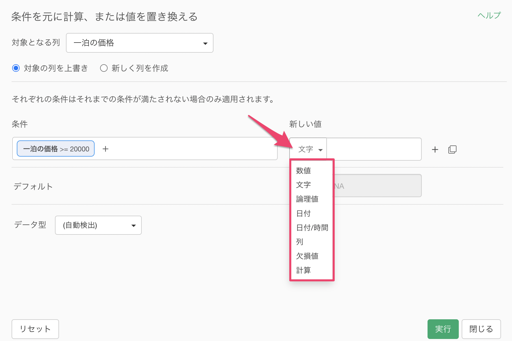 データ型が自動検出の場合は、値のタイプに「数値」、「文字」、「論理値」、「日付」、「日付/時間」を選択できるようになっています。ただし、新しい値に「数値」と「文字」などのタイプが混在している場合は、値の内容に合わせてデータタイプが自動的に決まるようになっています。