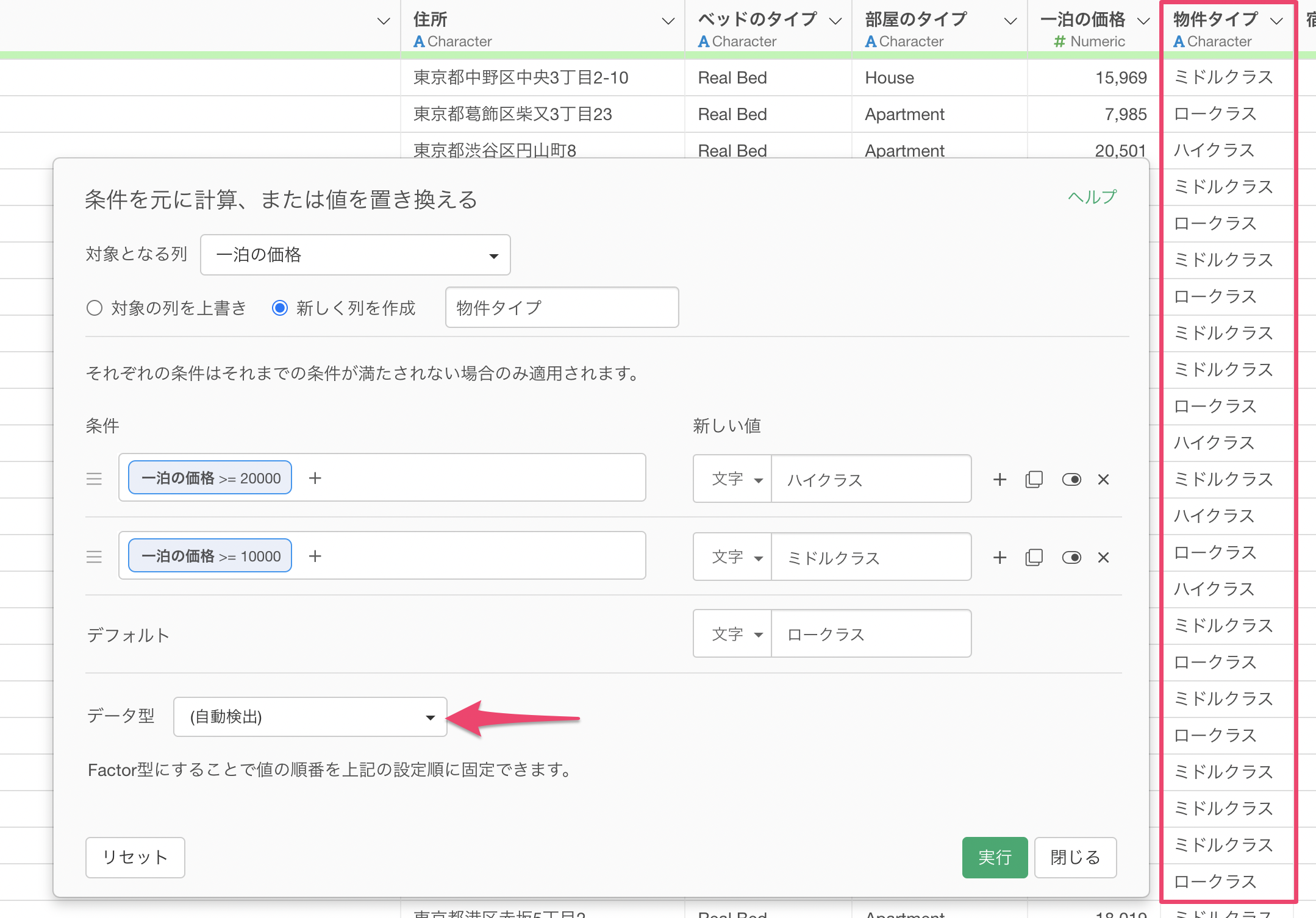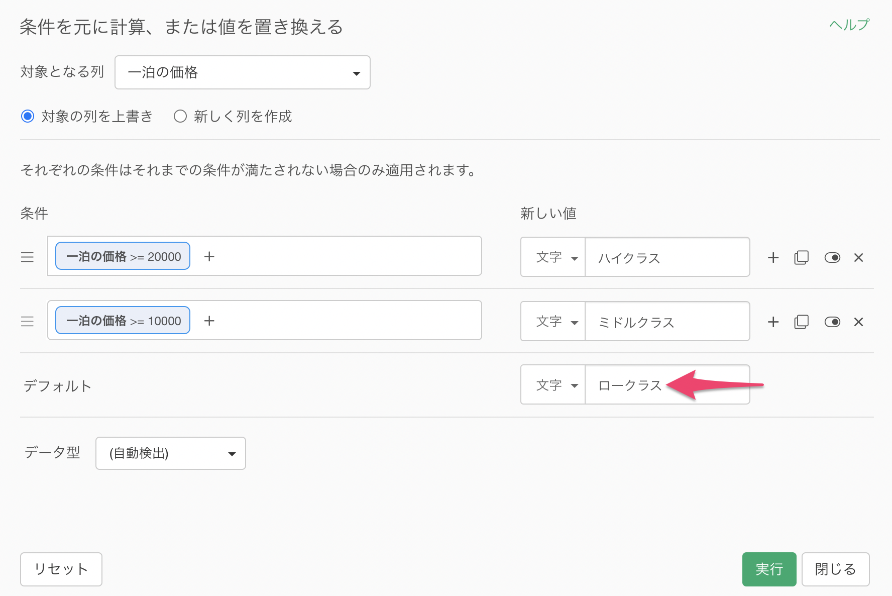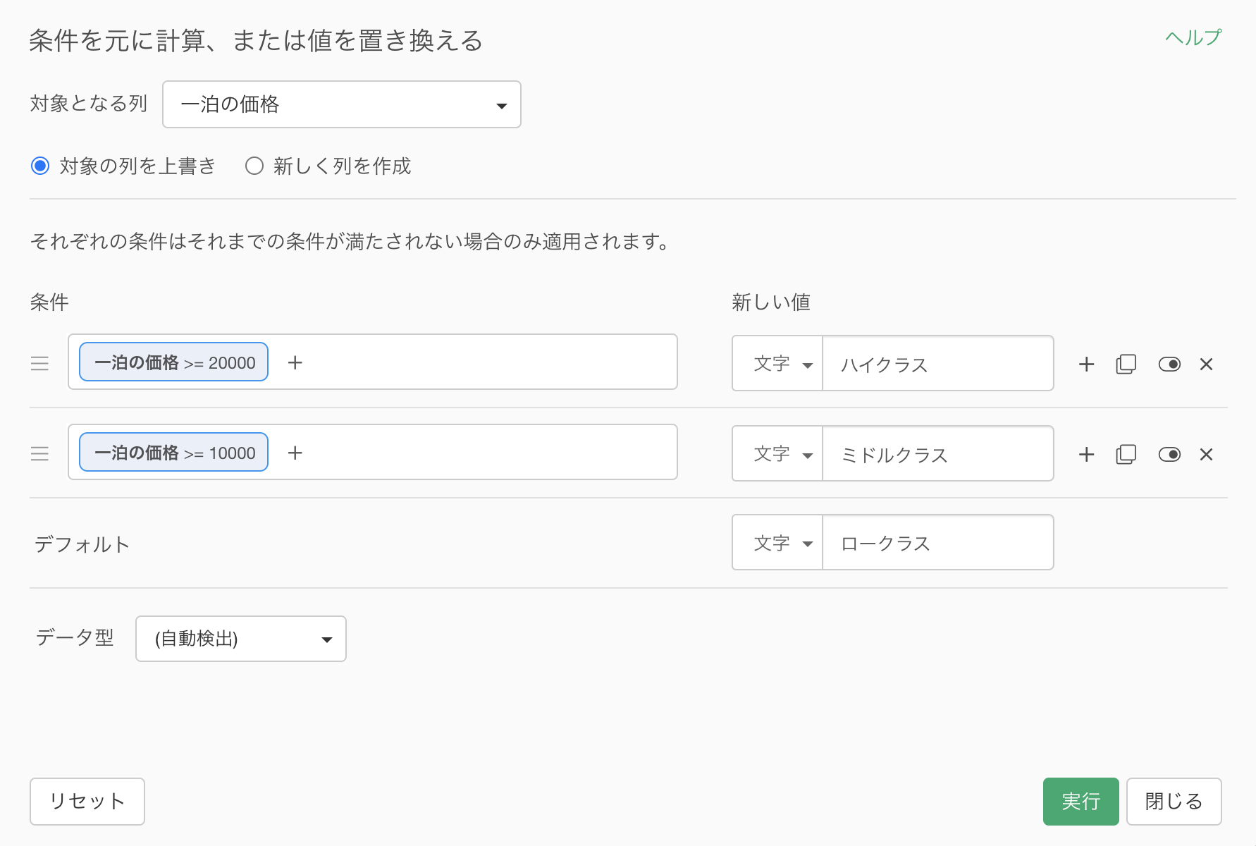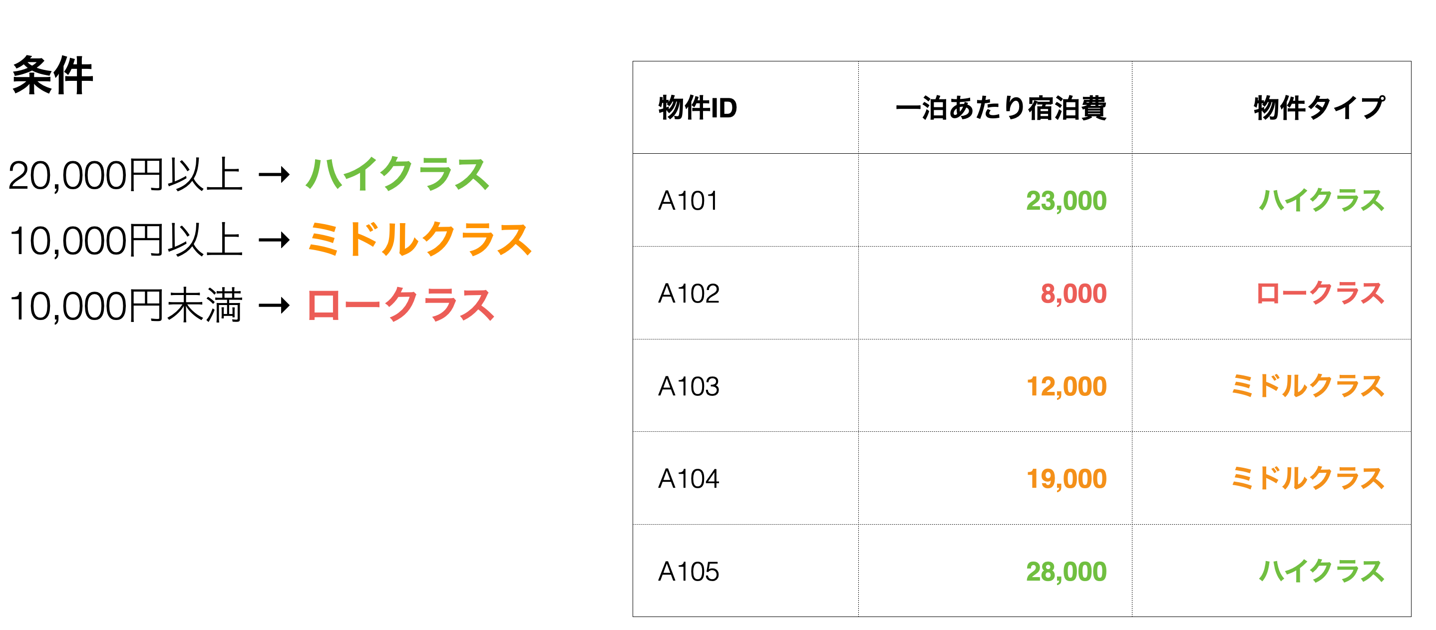 そのため、上記の設定では、一泊の価格が20,000円以上の行(物件)には、新しい値として、「ハイクラス」という値を返し、一泊の価格が10,000円以上のときには「ミドルクラス」、それ以外である10,000円未満には「ロークラス」を返します。