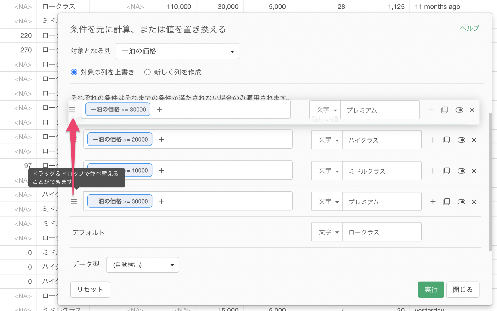 「条件を元に計算、または値を置き換える」を使うと、このデータを使って、1泊あたり宿泊費をもとに、以下のようにそれぞれの物件にラベル(ランク)を付けることができるようになります。
