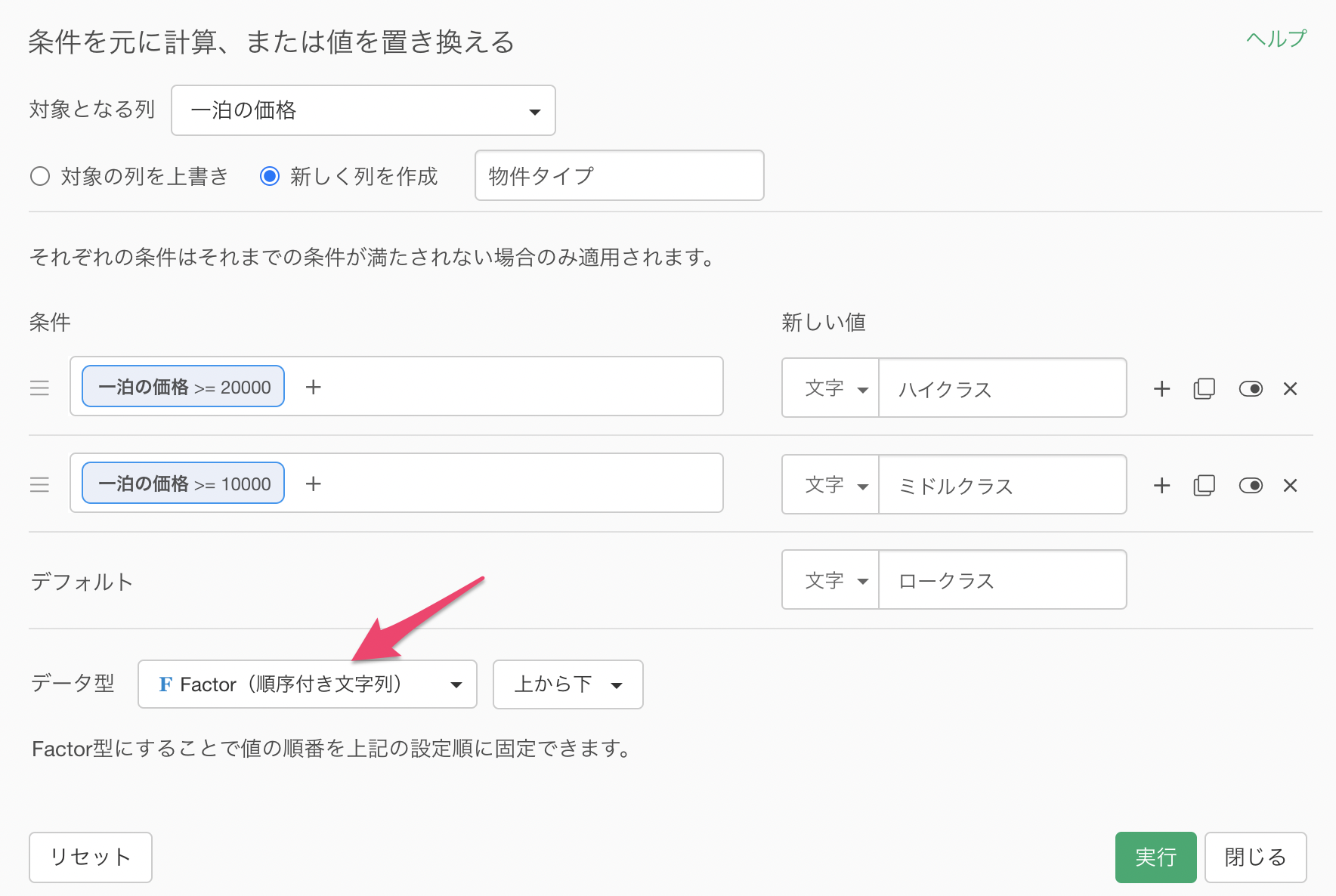 もし作成した新しい値に順序関係がある場合は、データ型を「Factor(順序付き文字列)」にすることで、チャートなどで可視化した時に順序を保って表示することができます。