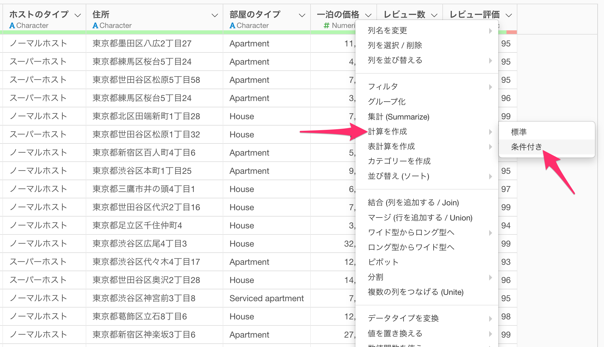 「条件を元に計算、または値を置き換える」は任意の列ヘッダーメニューから「計算を作成」の「条件付き」を選択することで利用できます。