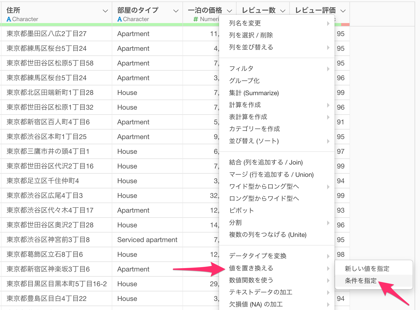また、任意の列ヘッダーメニューから「値を置き換える」の「条件を指定」からも利用が可能です。