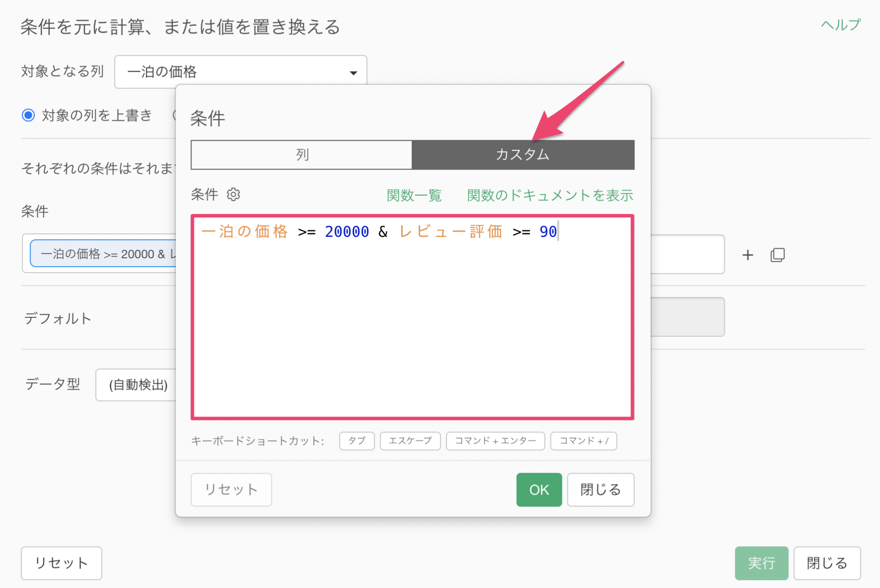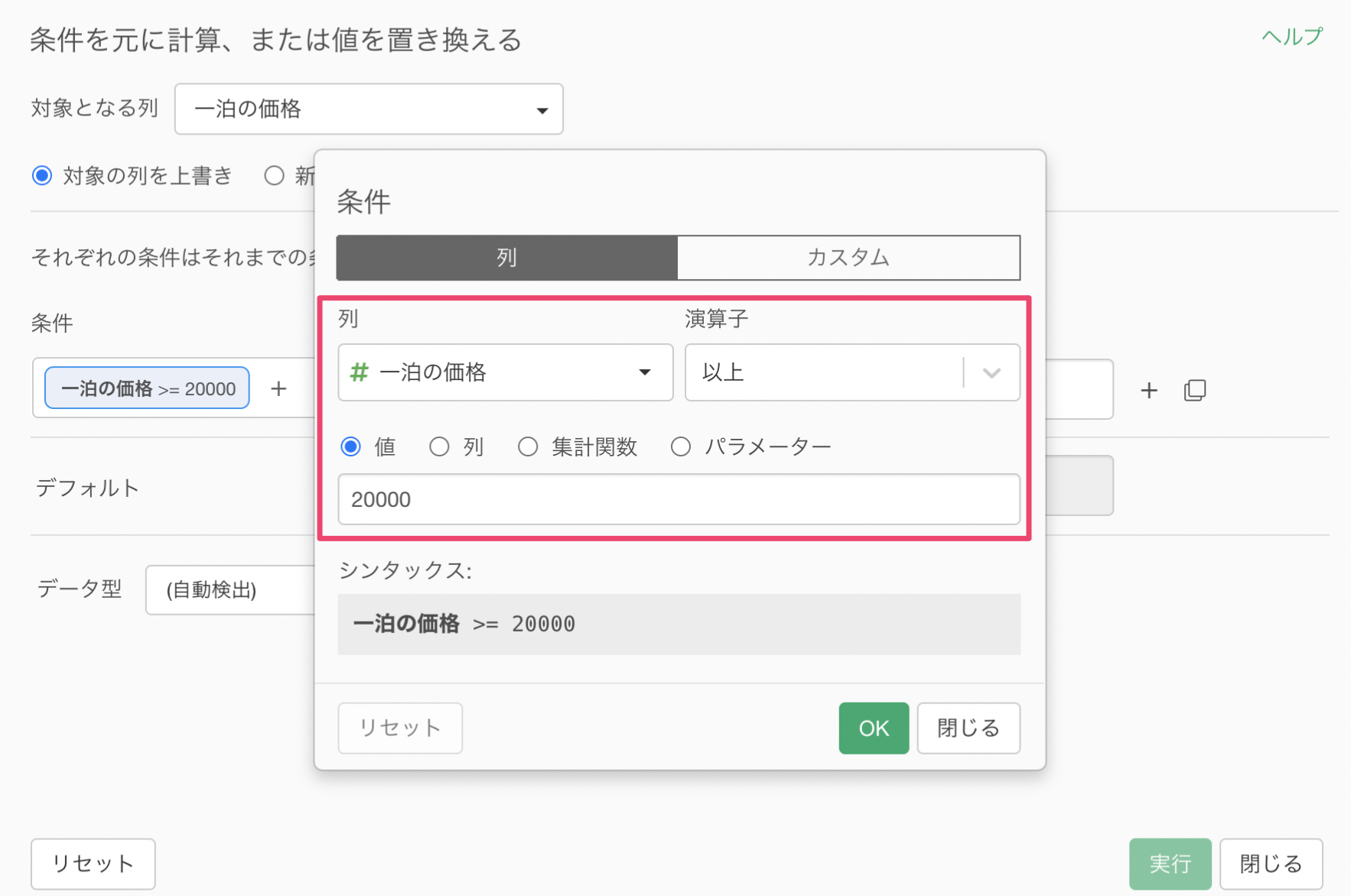 いずれかのメニューを選択すると、以下のように「条件を元に計算、または値を置き換える」のダイアログが表示されます。