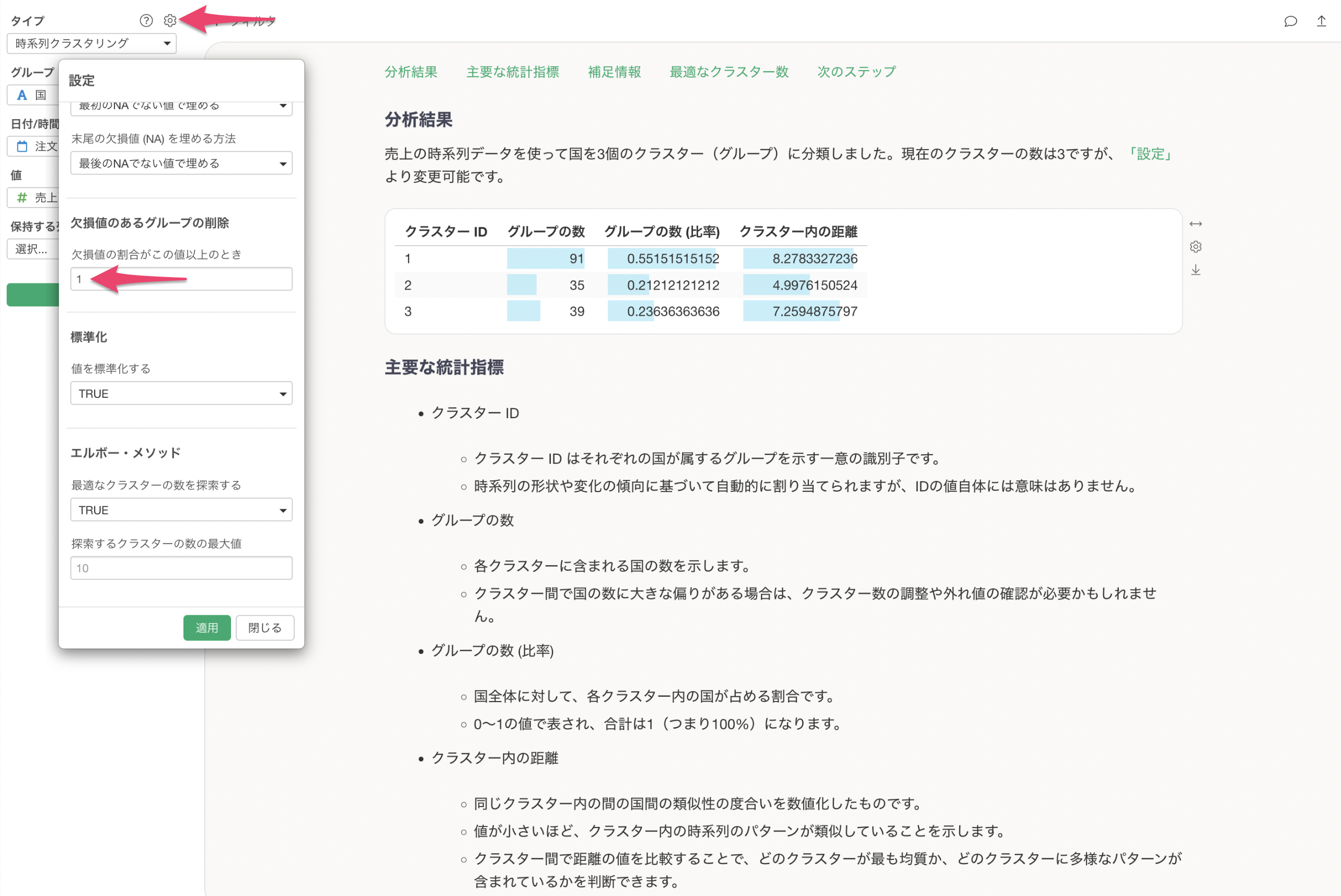 設定から「欠損値の割合がこの値以上」に対して、「1」を指定いただくと欠損値があったとしても全てのグループを対象にすることができるため、エラーなく実行ができるかと思います。