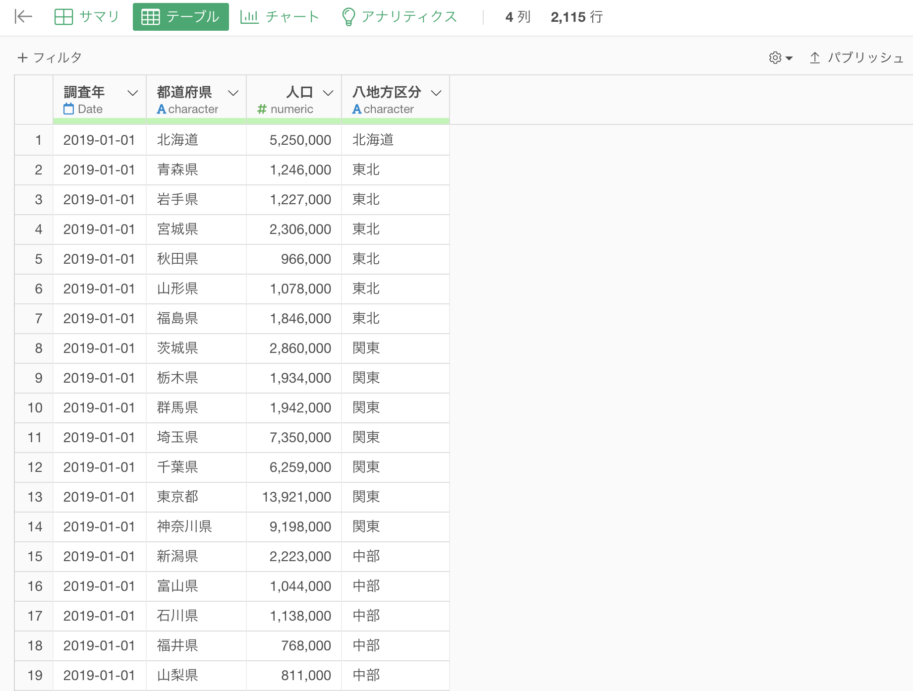 今回はサンプルデータとして、都道府県別の人口データを使用していきます。