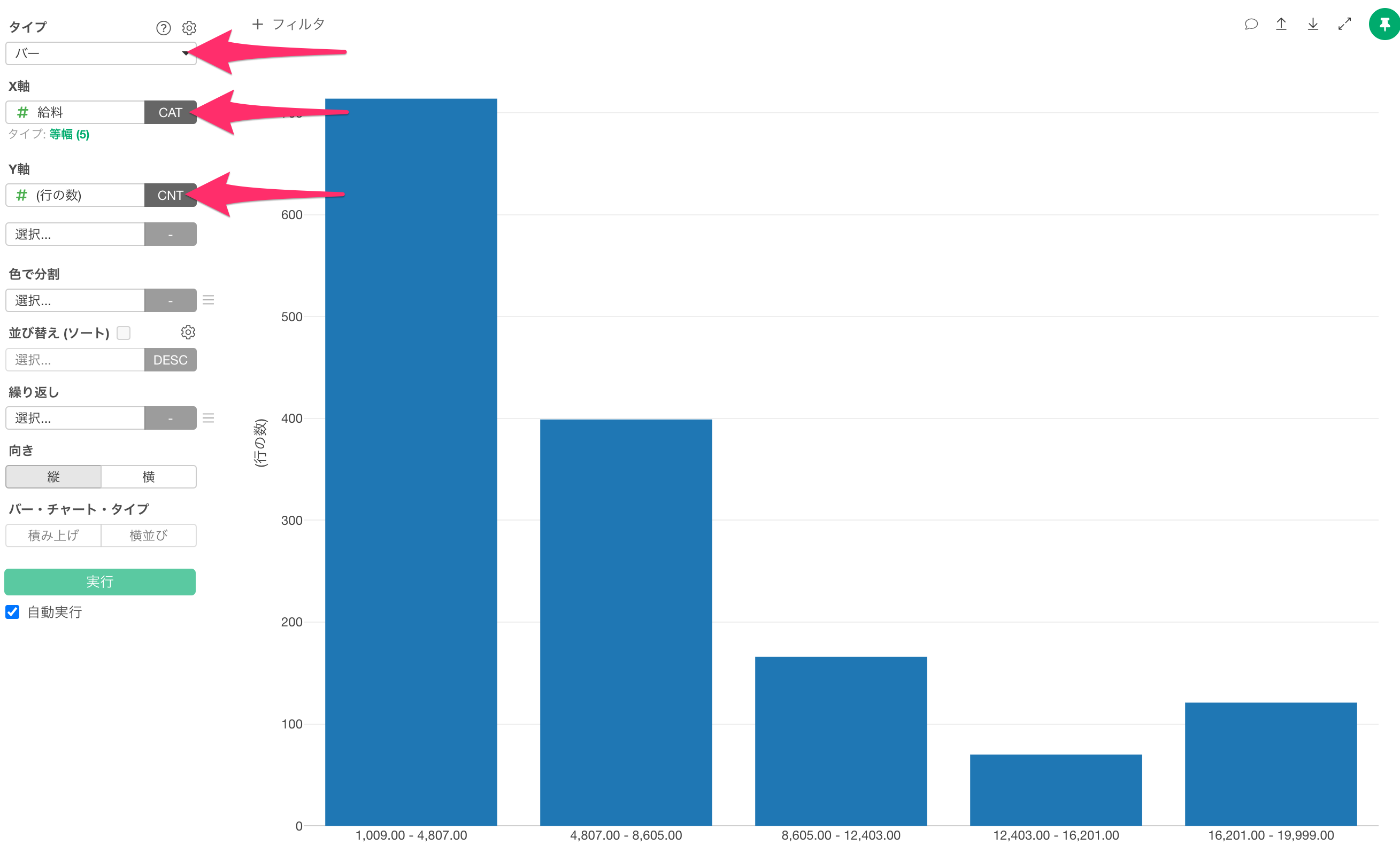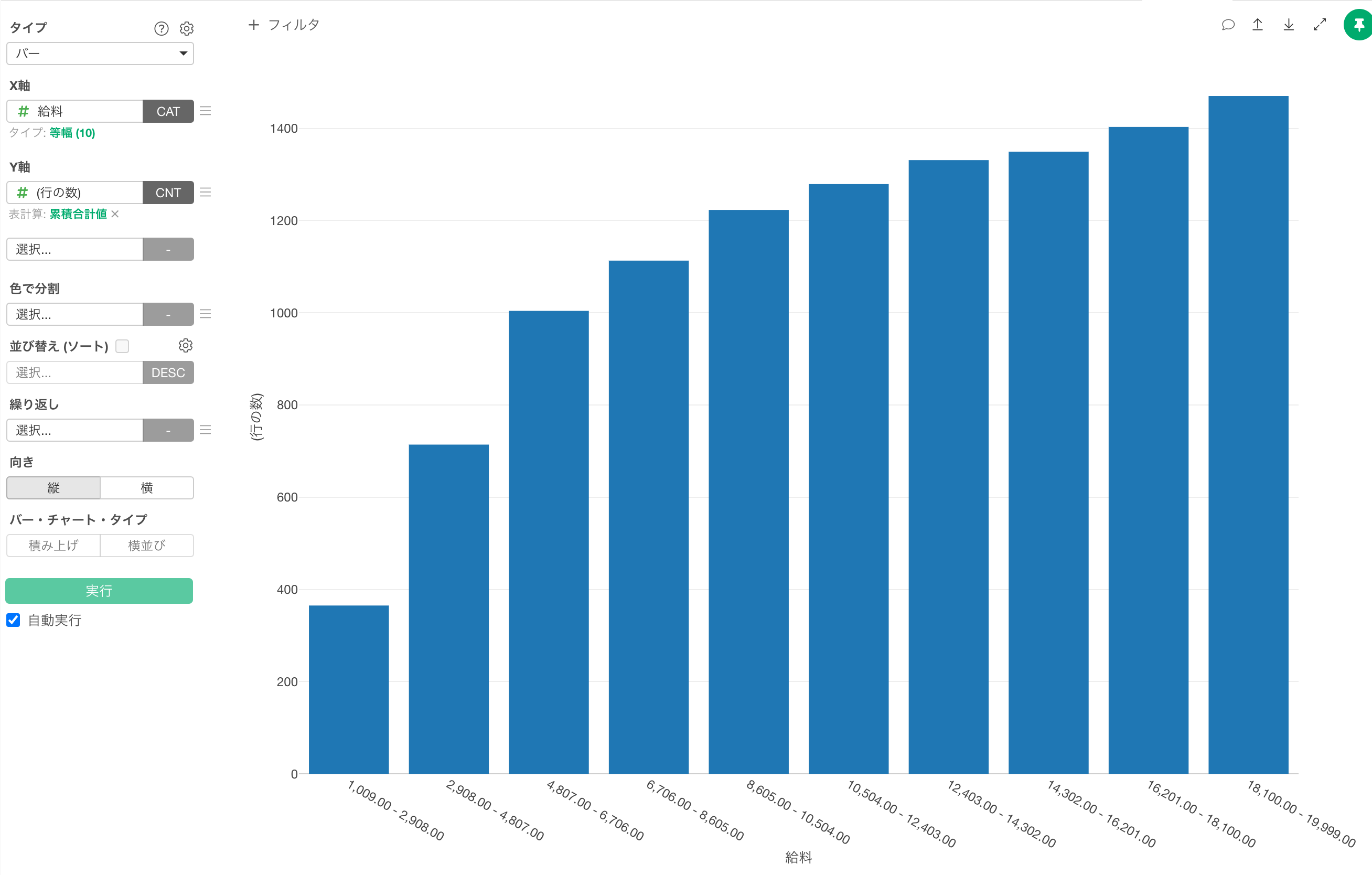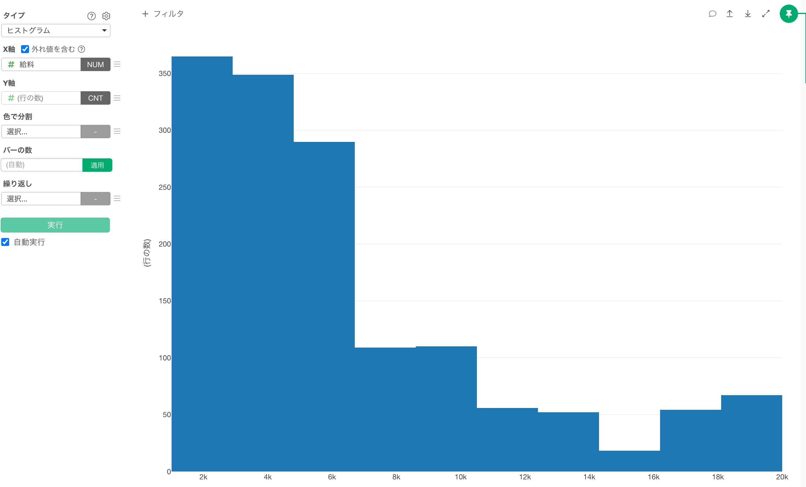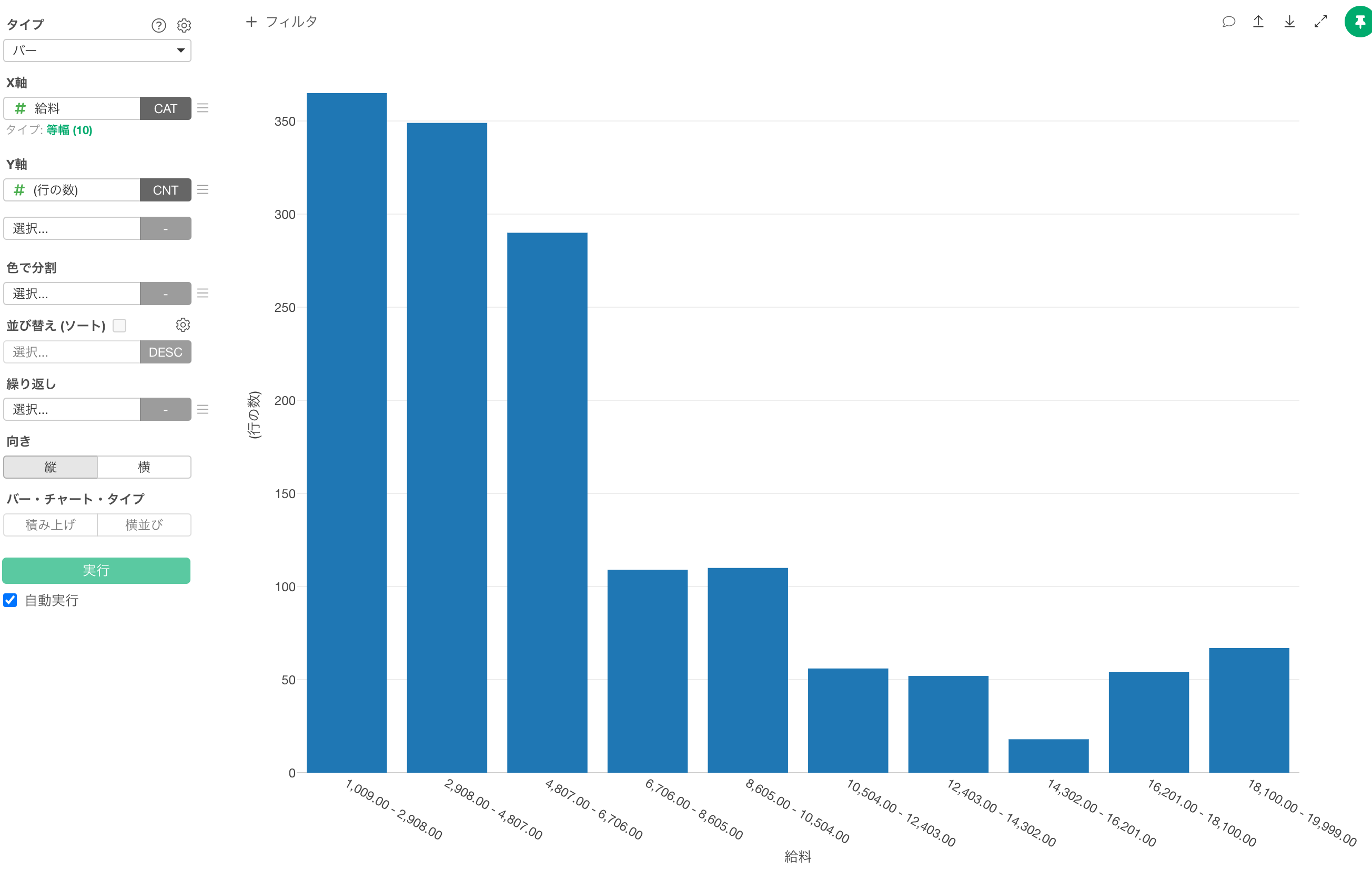 そのような時にはチャートビューに移動してチャートのタイプにバーを選択し、軸には分布を可視化したい「給料」を選択し、Y軸にはデフォルトである「行の数」を選択します。