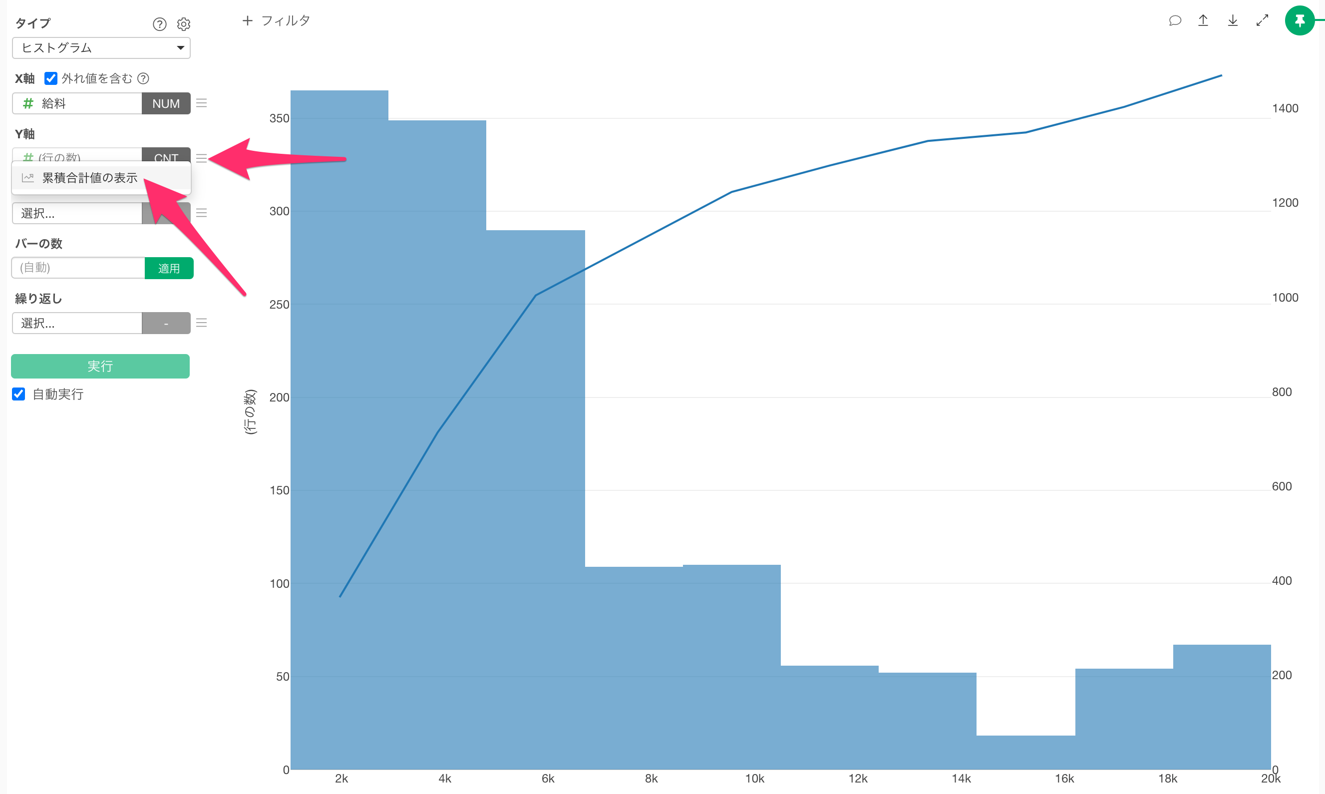 例えば、一行が一人の従業員を表すデータを使って給料の累積ヒストグラムを可視化したかったとします。