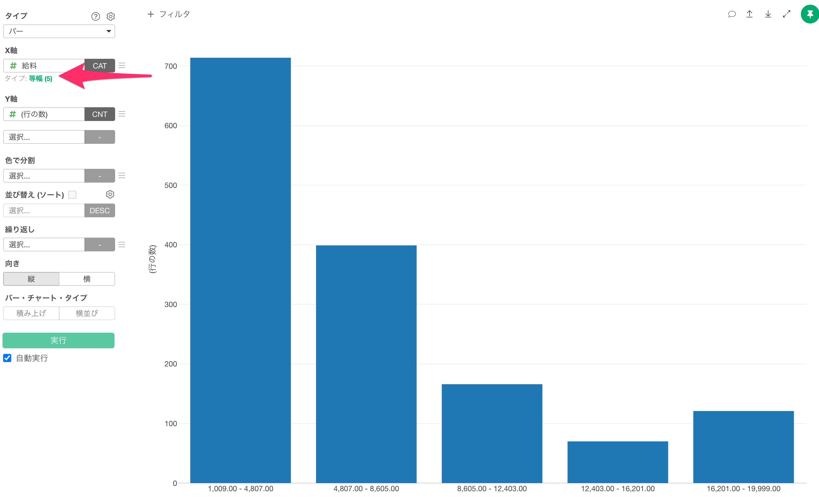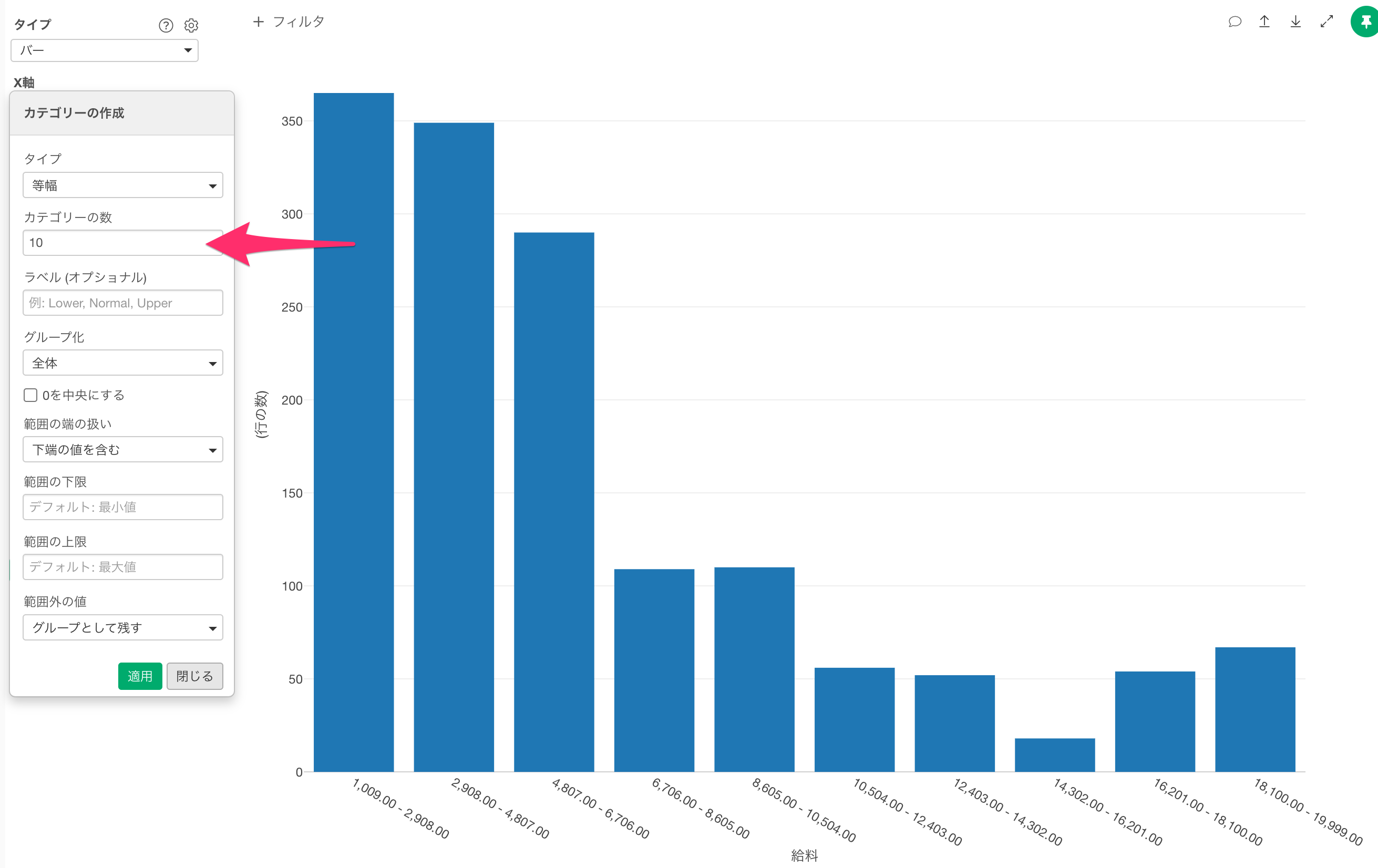 この時、給料の一意の数が多い場合、自動的にX軸ではカテゴリーが作成され、等幅で五つのグループに分かれます。