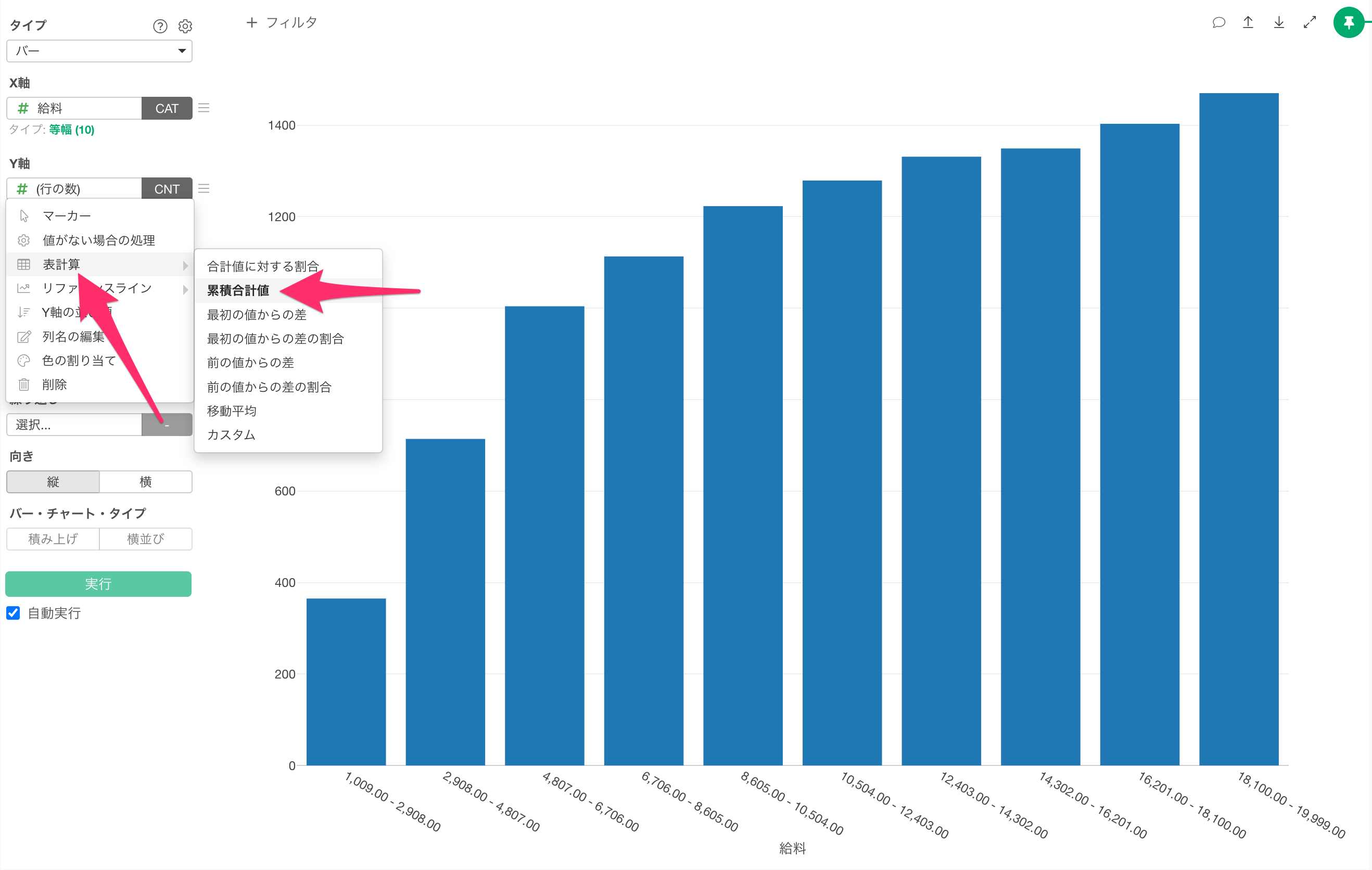 このバーチャートを累積ヒストグラムに変えたい場合は、Y軸のメニューから表計算を選択して、表計算のサブメニューから「累積合計値」を選択します。